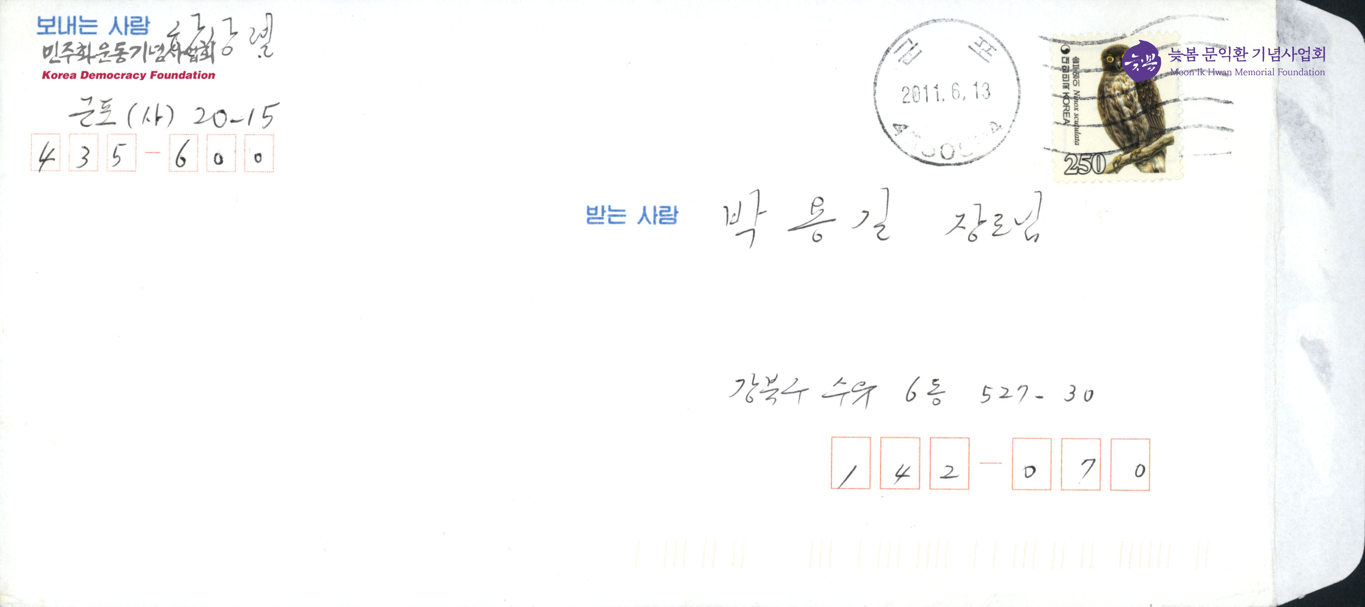 - 한상렬이 박용길 장로에게 '한몸 평화, 통일 평화'와 늘 고맙다는 내용을 적어 보낸 서신