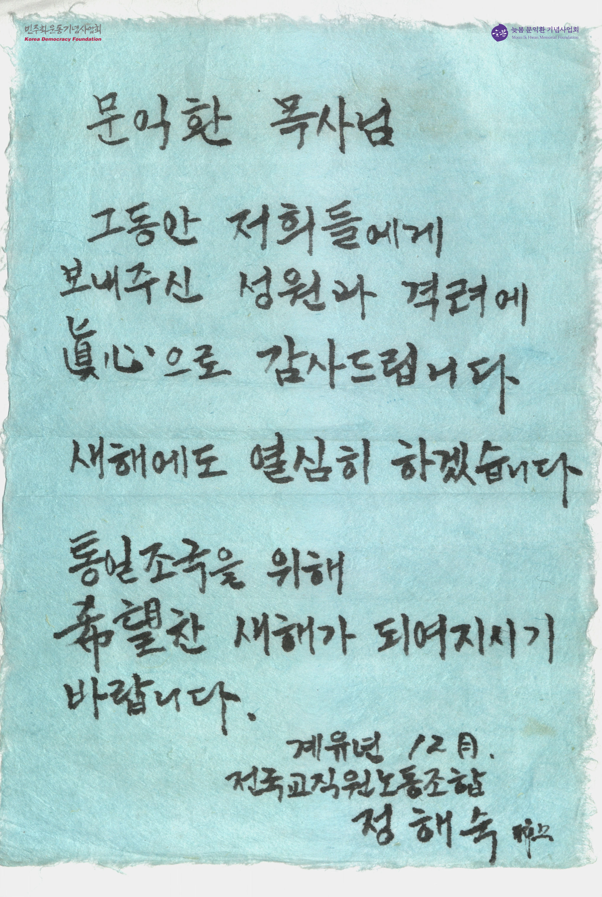 - 정해숙이 문익환 목사에게 성원과 격려에 대한 감사함과 희망찬 새해가 되기를 바란다는 내용을 적어 보낸 연하장