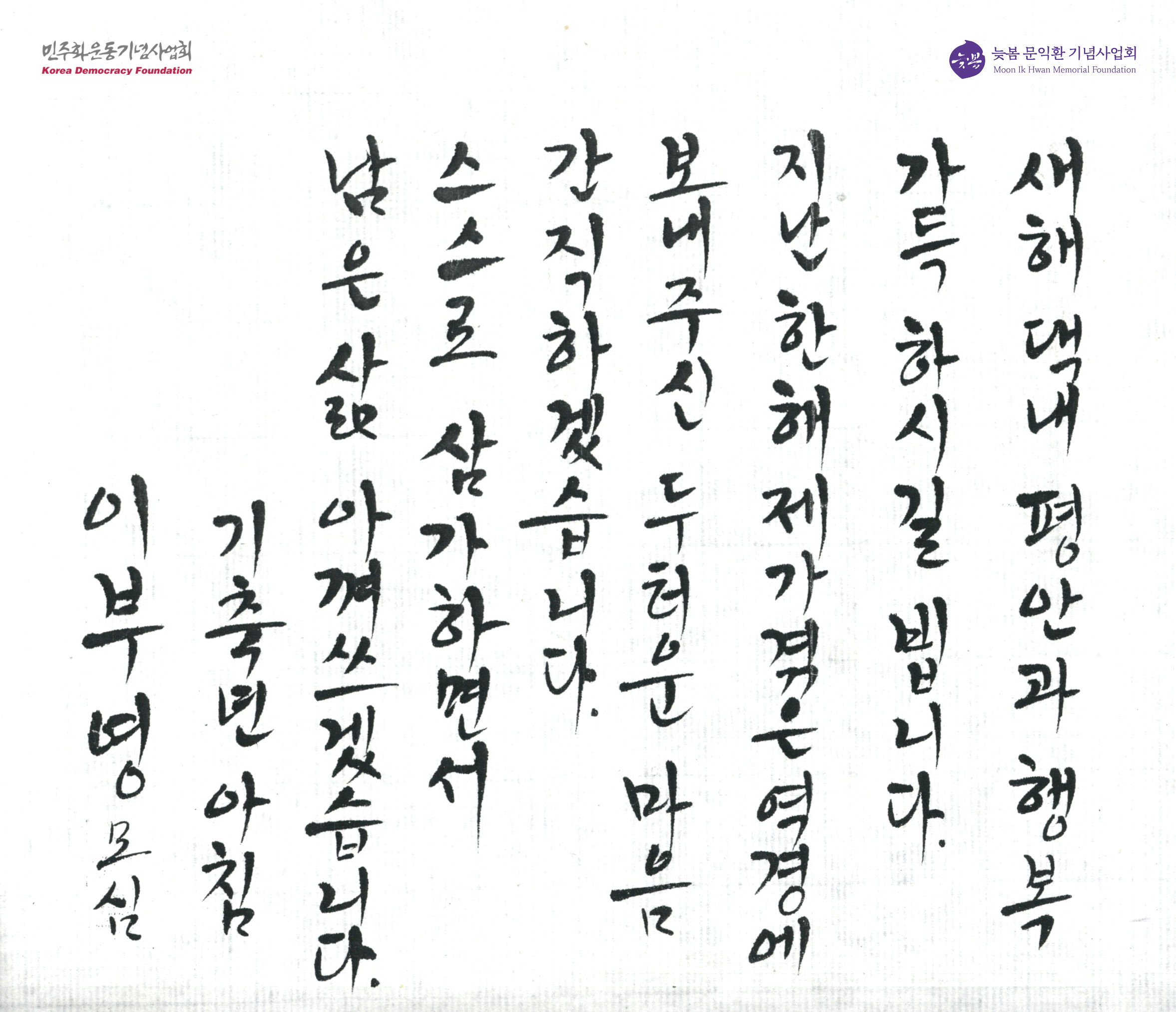 - 이부영이 박용길 장로와 가족들에게 지난 한해 자신이 겪은 역경에 보내준 두터운 마음 간직하겠다는 내용을 적어 보낸 서신