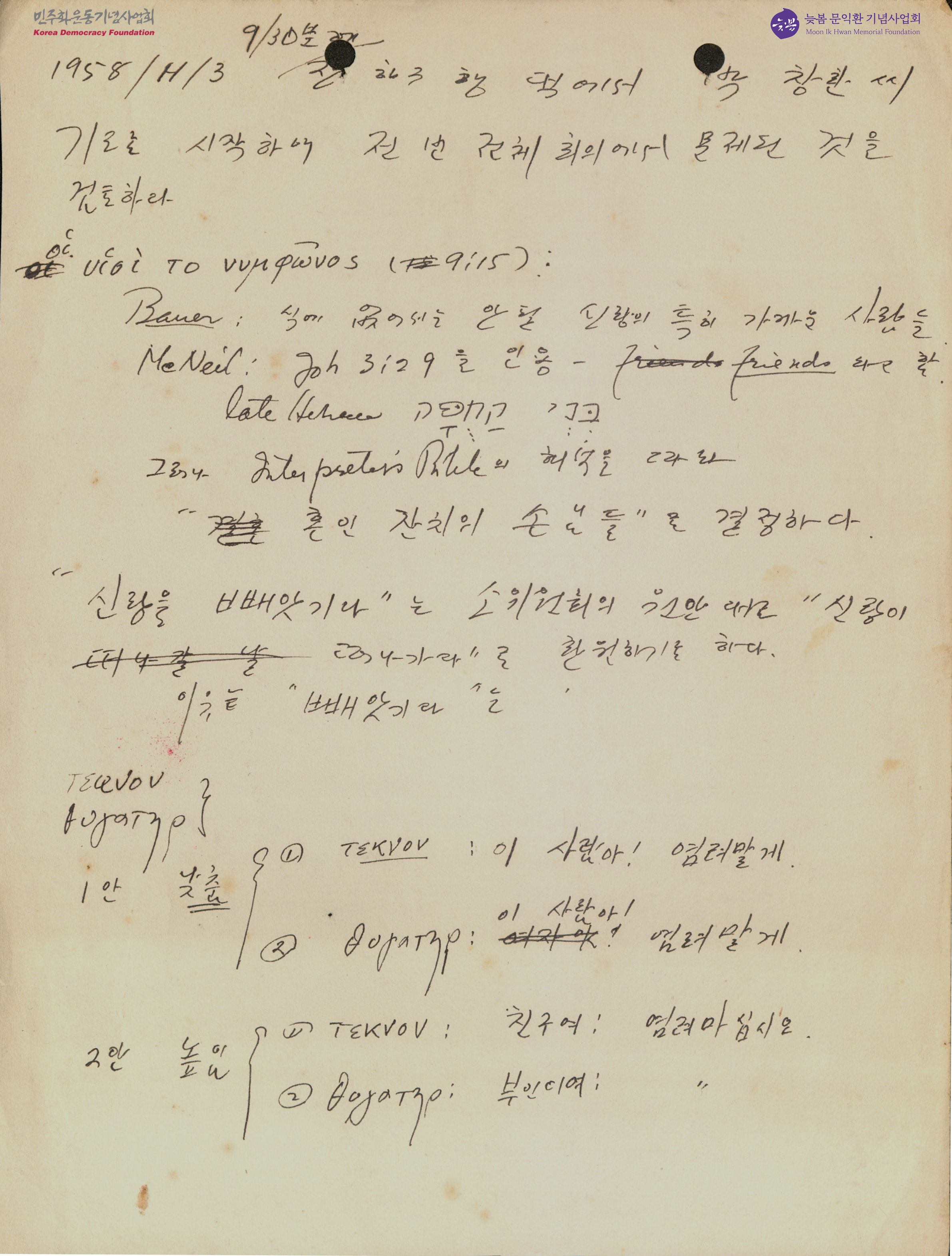 - 문익환 목사가 지난번 전체회의에서 성서번역의 문제된 부분을 검토한 내용을 적어 놓은 원고