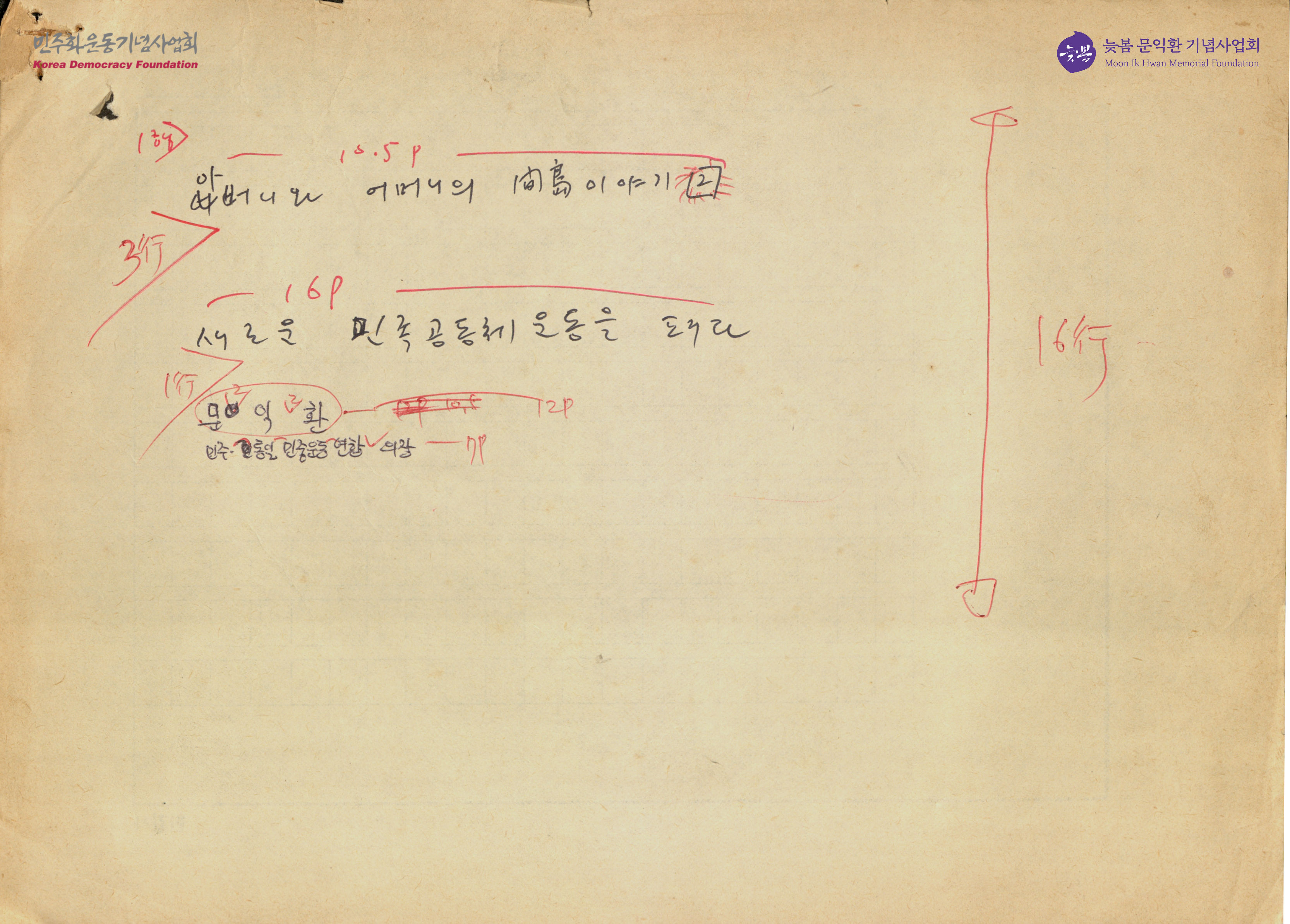 - 문익환 목사와 김신묵이 141명의 이민단이 두만강을 건너와 명동으로 들어가던 경로에 대해 나눈 대화를 적어 놓은 원고