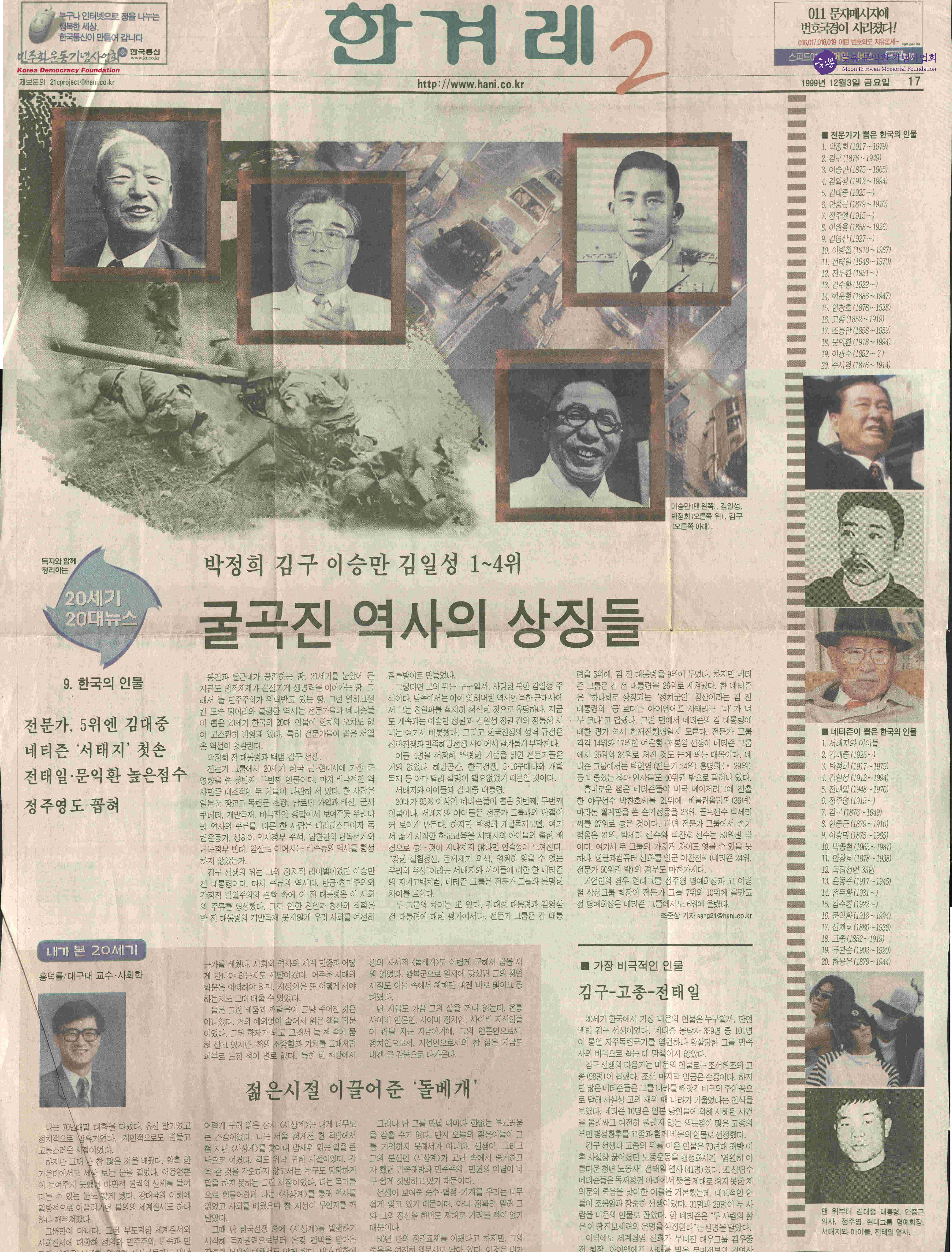 - 한겨레 신문에서 한국의 20세기 인물들에 대하여 전문가들이 뽑은 서열과 20대가 대부분인 네티즌들의 서열을 비교하며 세대간의 인식의 차이를 보여주는 기사를 실은 신문스크랩