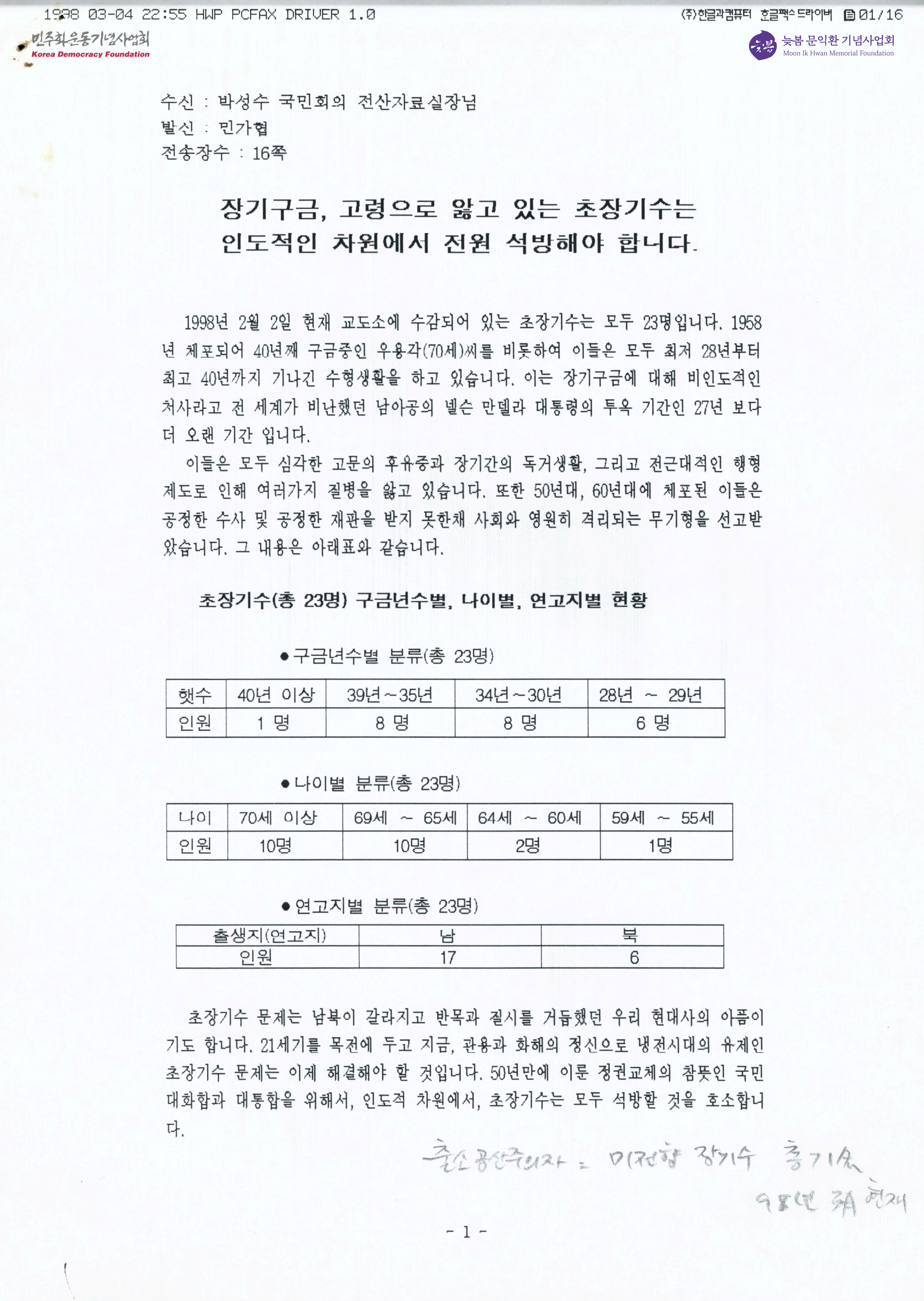 - 28년에서 40년동안 감옥에 갇혀있었던 초장기수들이 현재 고령의 몸 상태와 오랜 구금생활로 인하여 고통받고 있다는 사실을 언급하고, 장기수들의 구금정보를 정리한 표를 제시하면서 그들의 석방을 요청하는 호소문