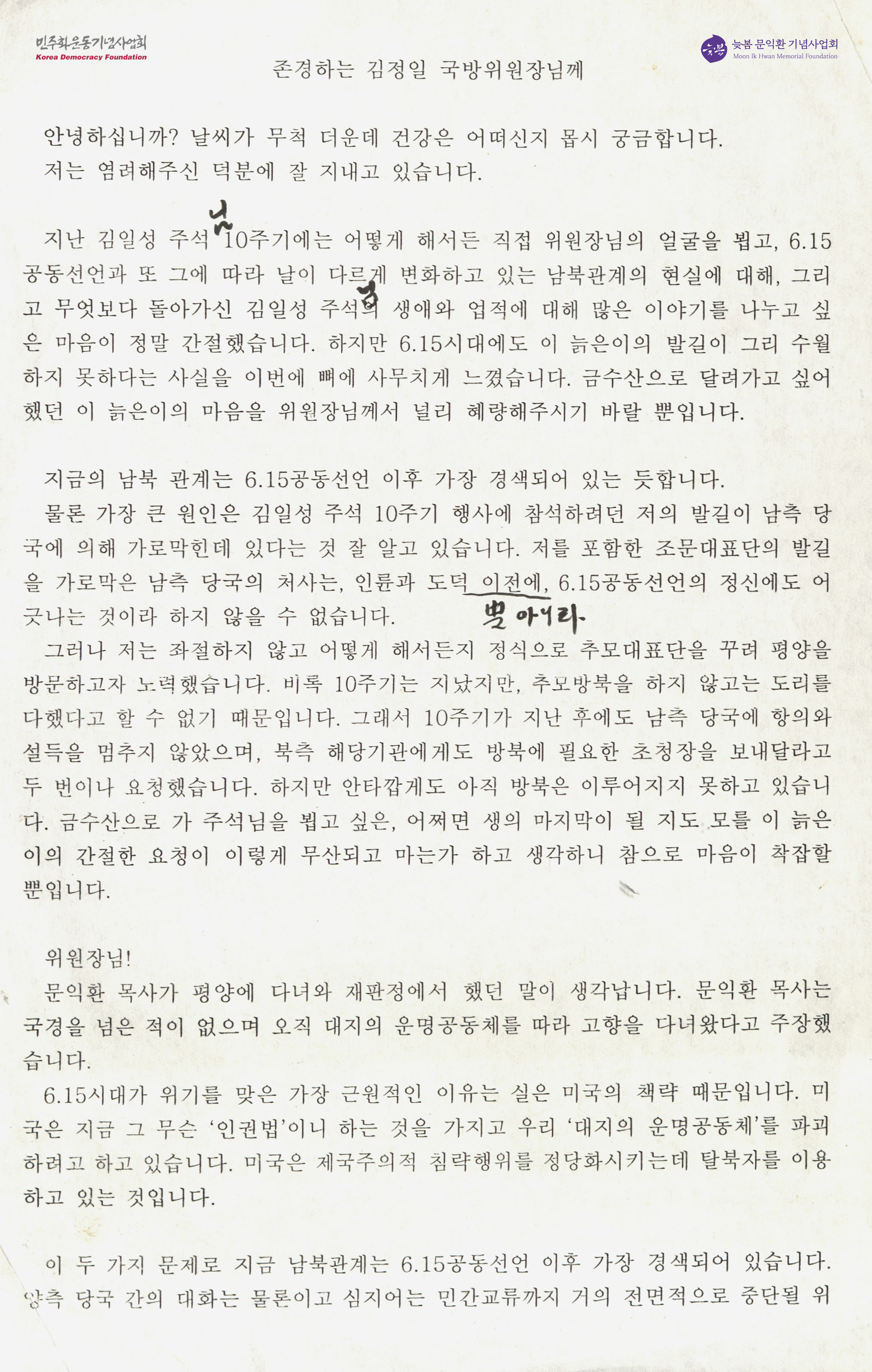 - 박용길 장로가 김정일에게 김일성의 10주기를 가지 못해 안타깝다는 점 및 미국이 탈북자를 제국주의적 침략행위를 정당화시키는데 이용하고 있다는 내용을 적어 보낸 서신. 뒷 장에 문익환 목사의 '북간도에 온 그리스도'라는 글을 적었음