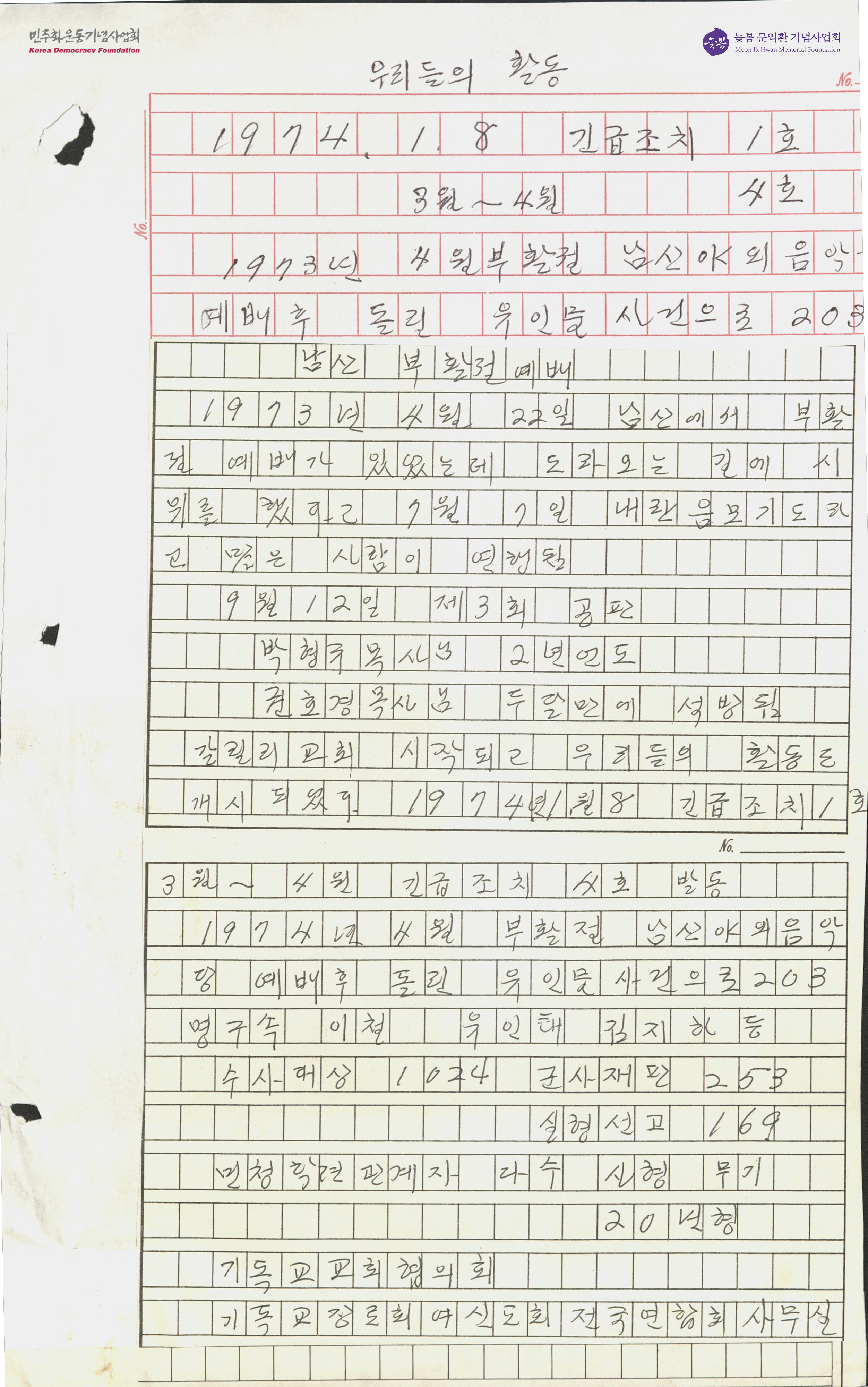 - 박용길 장로가 1973년 4월 22일 남산 부활절 예배에서 돌아오는 길에 연행된 이야기 및 1974년 긴급조치 이후의 활동과 구속된 이들의 형량을 적어놓은 원고