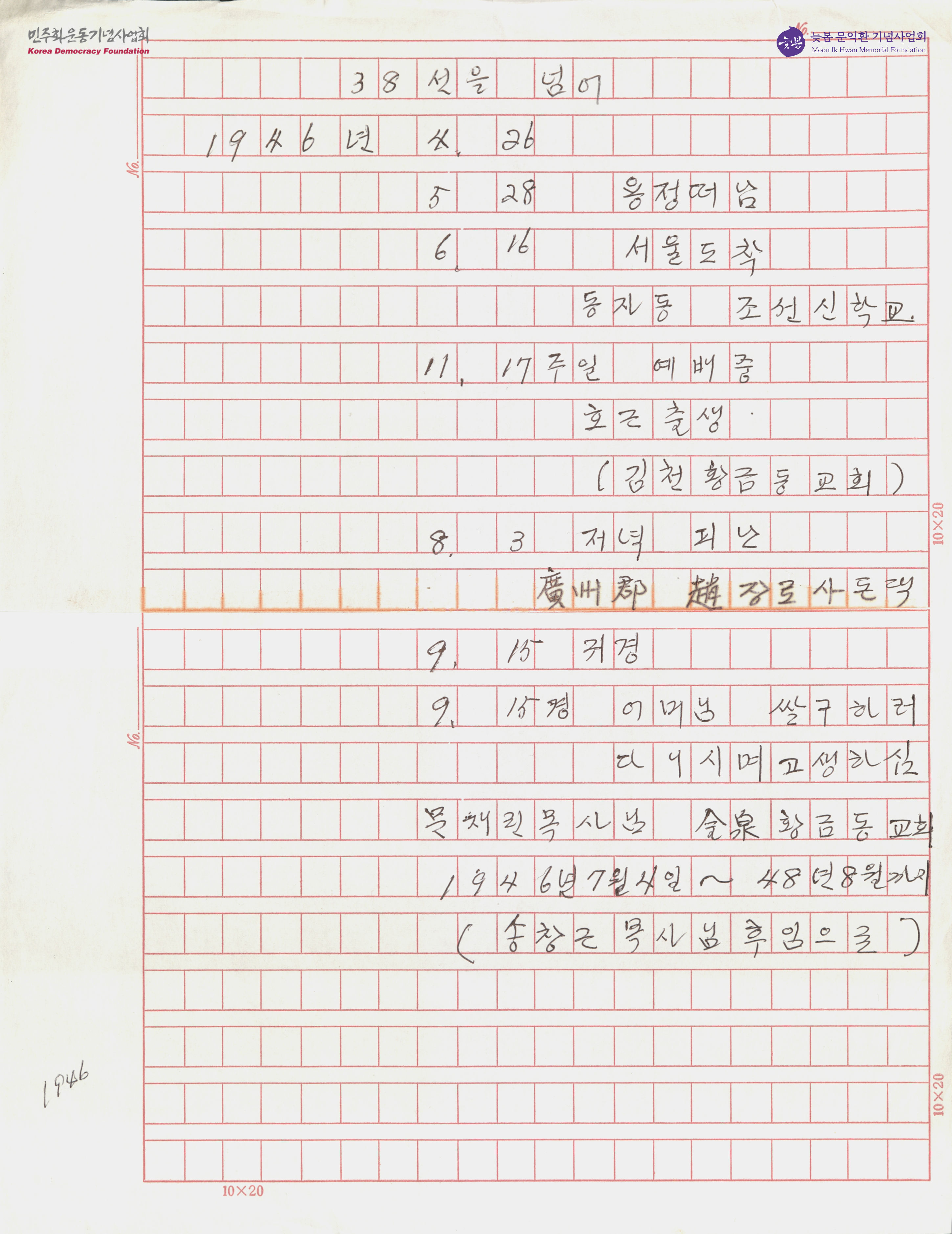 - 박용길 장로가 1946년 4월 26일부터 9월 15일까지 3.8선을 넘는 과정을 적어놓은 원고