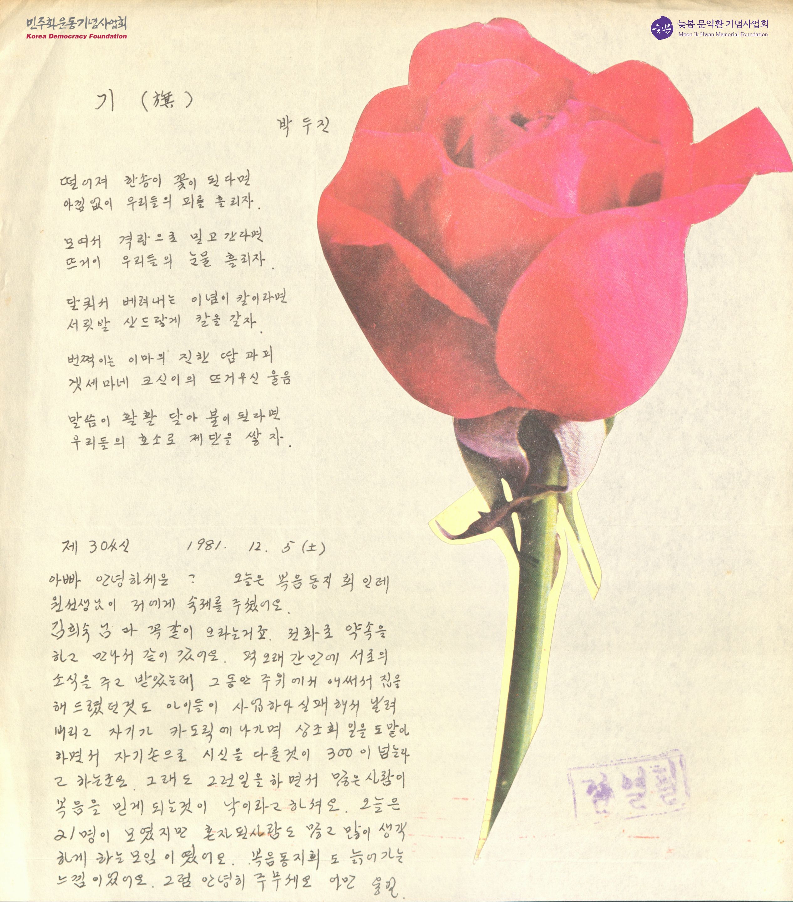 - 박용길 장로가 문익환 목사에게 복음동지회에서 받은 숙제와 원선생의 소식을 들은 사실을 적어 보낸 서신. 박두진이 지은 시 '기'를 옮겨 적음
