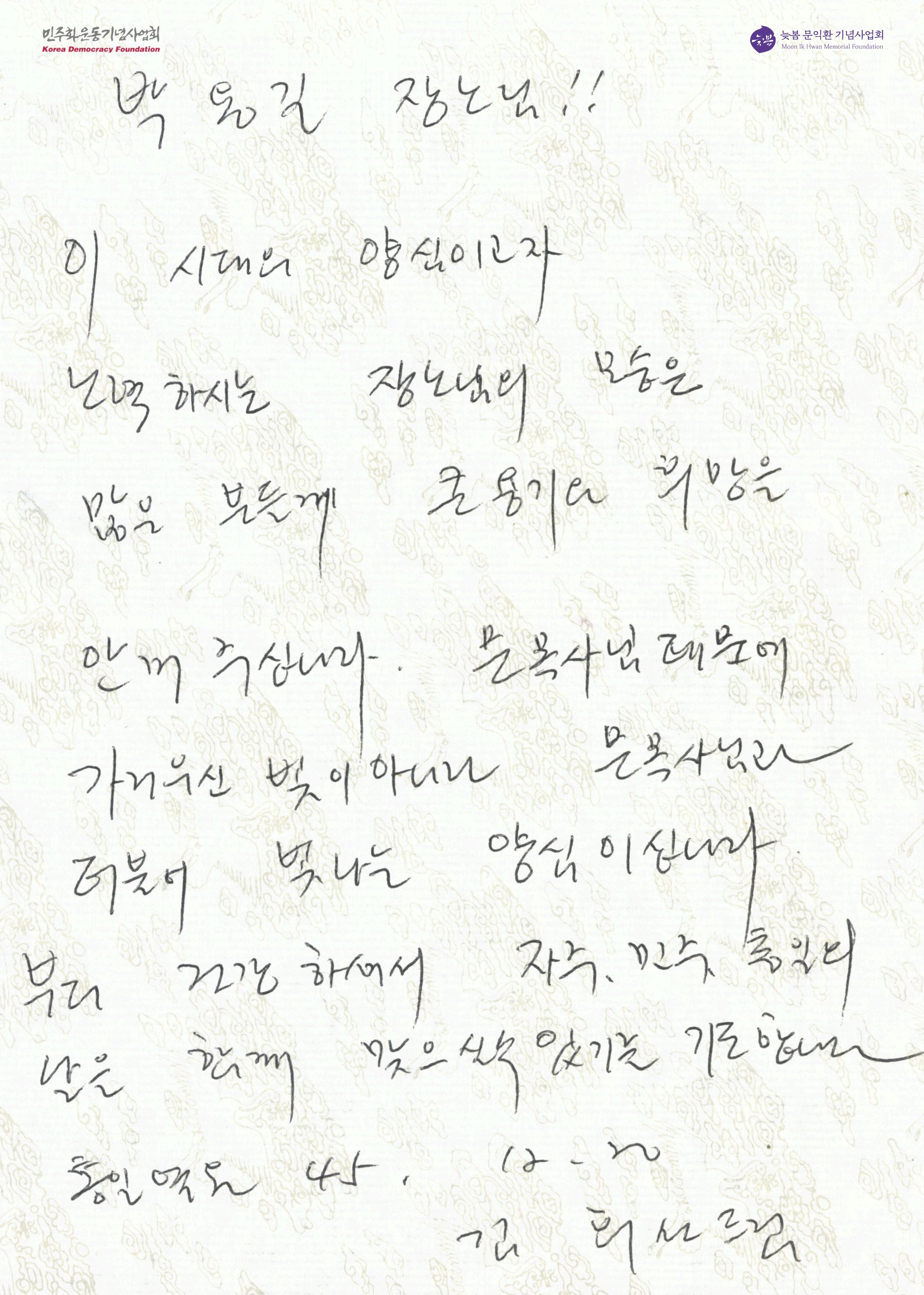 - 김희선이 박용길 장로에게 통일염원 45년을 맞아 건강히 자주, 민주, 통일의 날을 함께 맞을 수 있기를 기도한다는 내용을 적어 보낸 서신