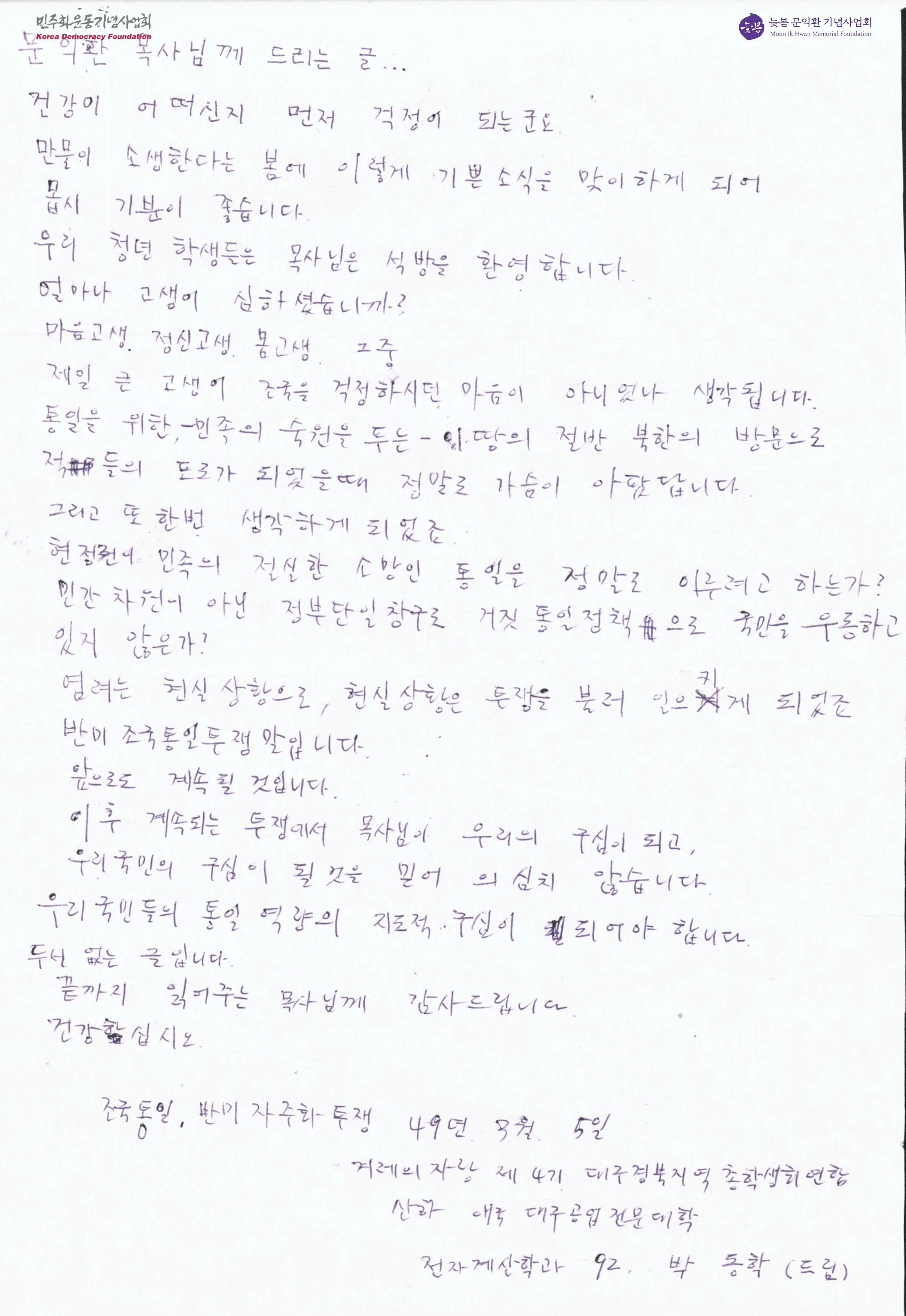 - 박동학이 문익환 목사에게 석방을 환영한다는 내용과 반미조국통일투쟁을 계속 이어가겠다는 다짐을 적어 보낸 서신