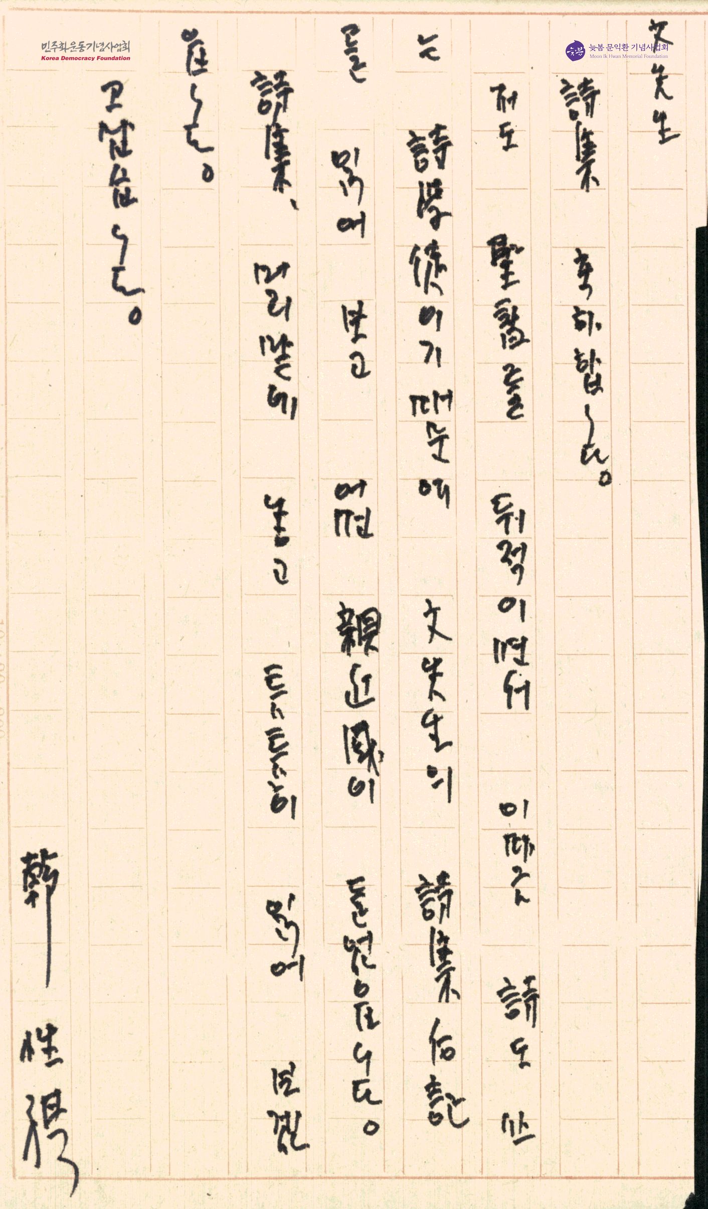 - 한성득이 문익환 목사에게 그가 시집을 낸 것을 축하하고 감사하는 마음을 적어 보낸 서신