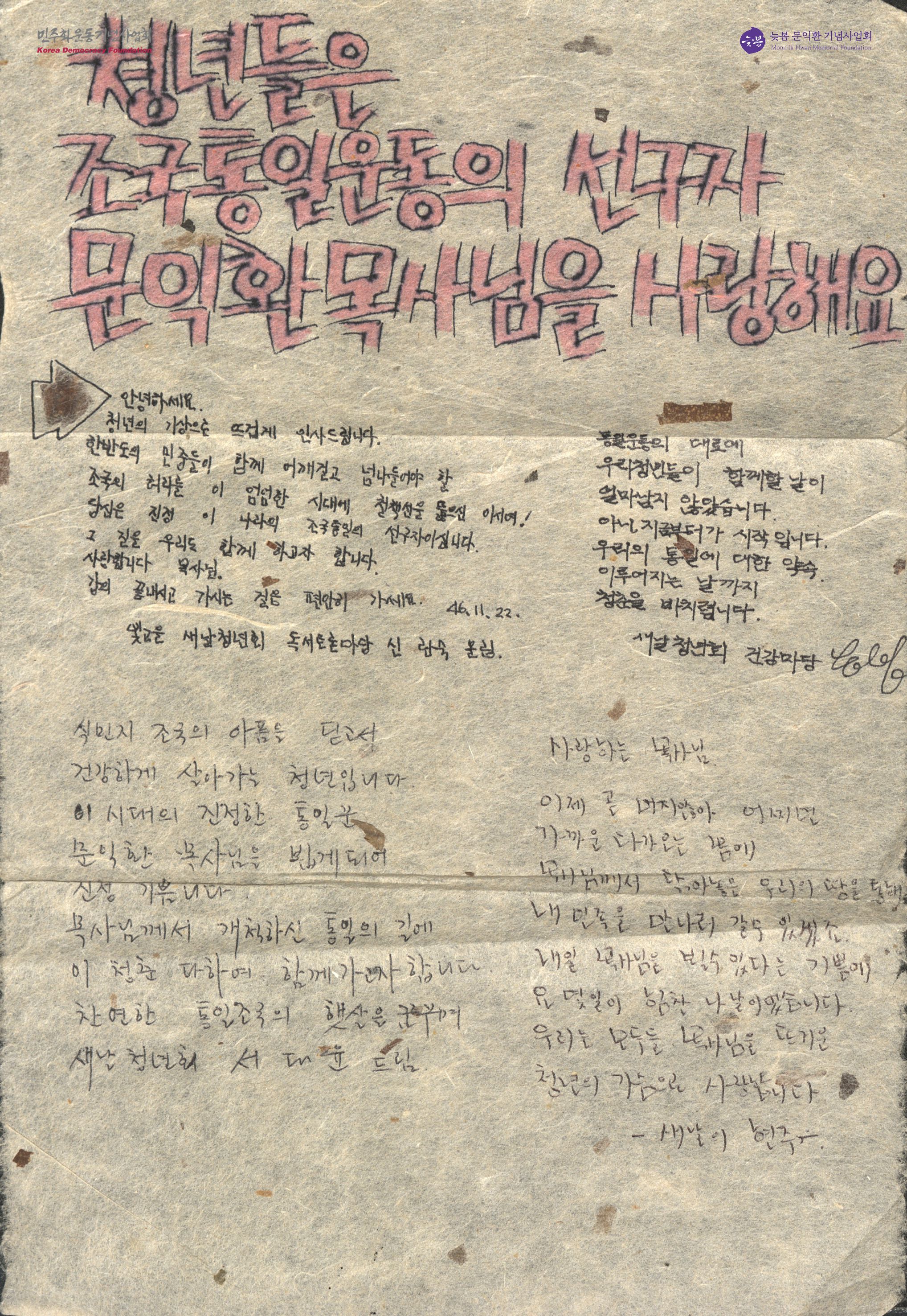 - 새날청년회가 문익환 목사에게 조국통일의 선구자인 그를 사랑한다는 내용을 적어 보낸 서신