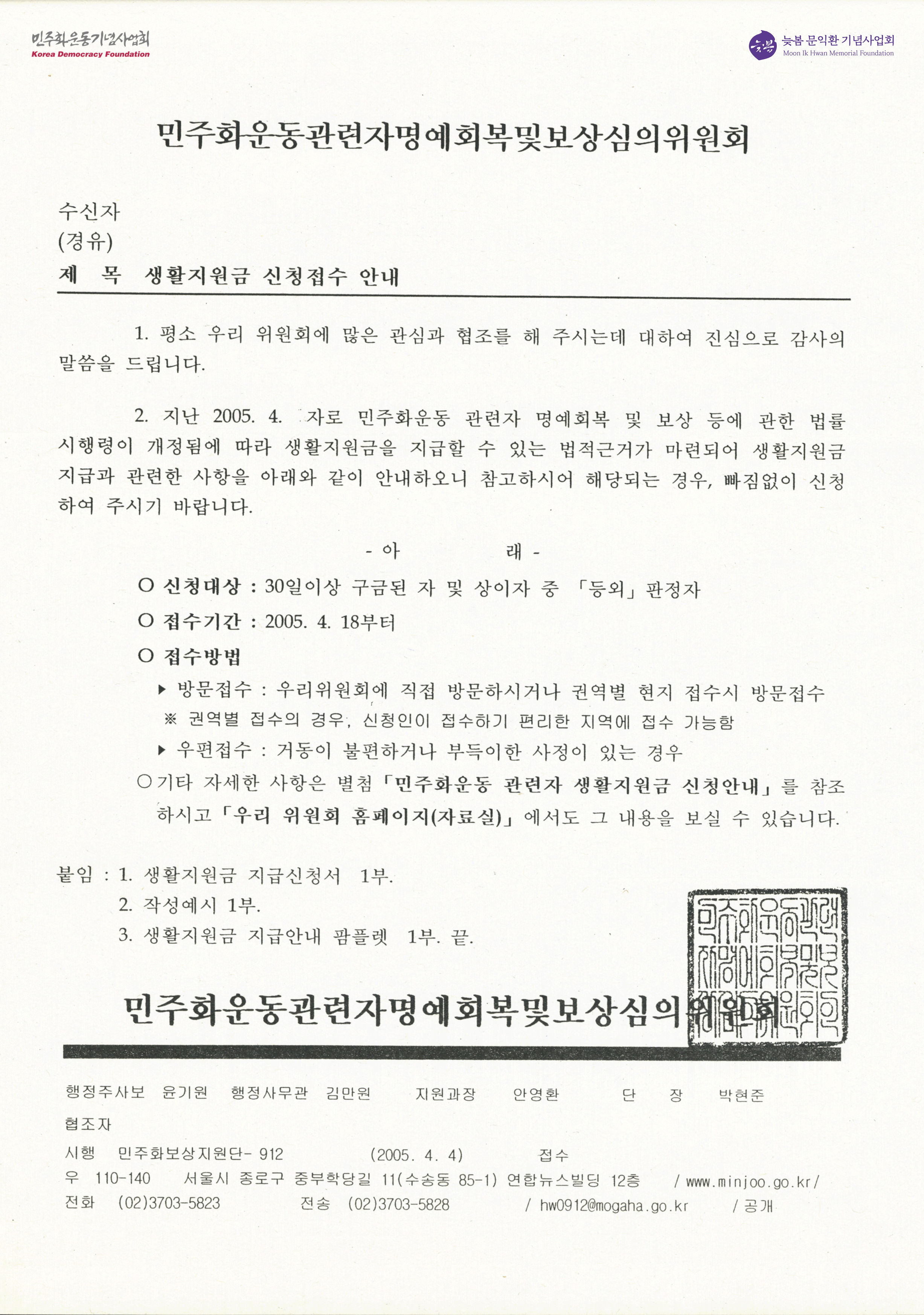 - 민주화운동관련자 명예회복 및 보상심의위원회에서 2005년 4월부터 민주화운동 관련자 보상에 관한 법률이 시행되면서 생활지원금 지급과 관련한 사항을 적은 안내문