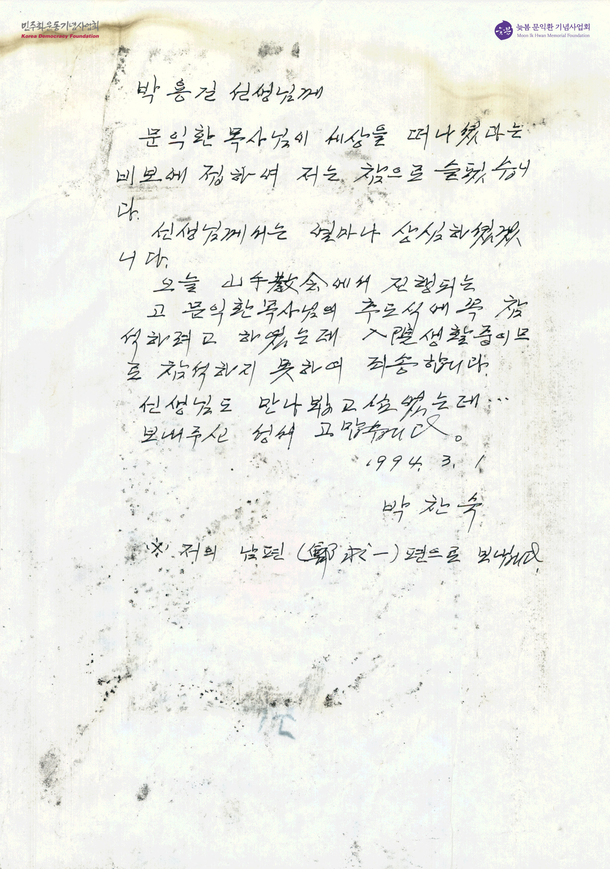 - 박찬숙이 박용길 장로에게 문익환 목사가 죽은 소식을 듣고 슬퍼하는 마음과 위로하는 내용을 적어 보낸 서신