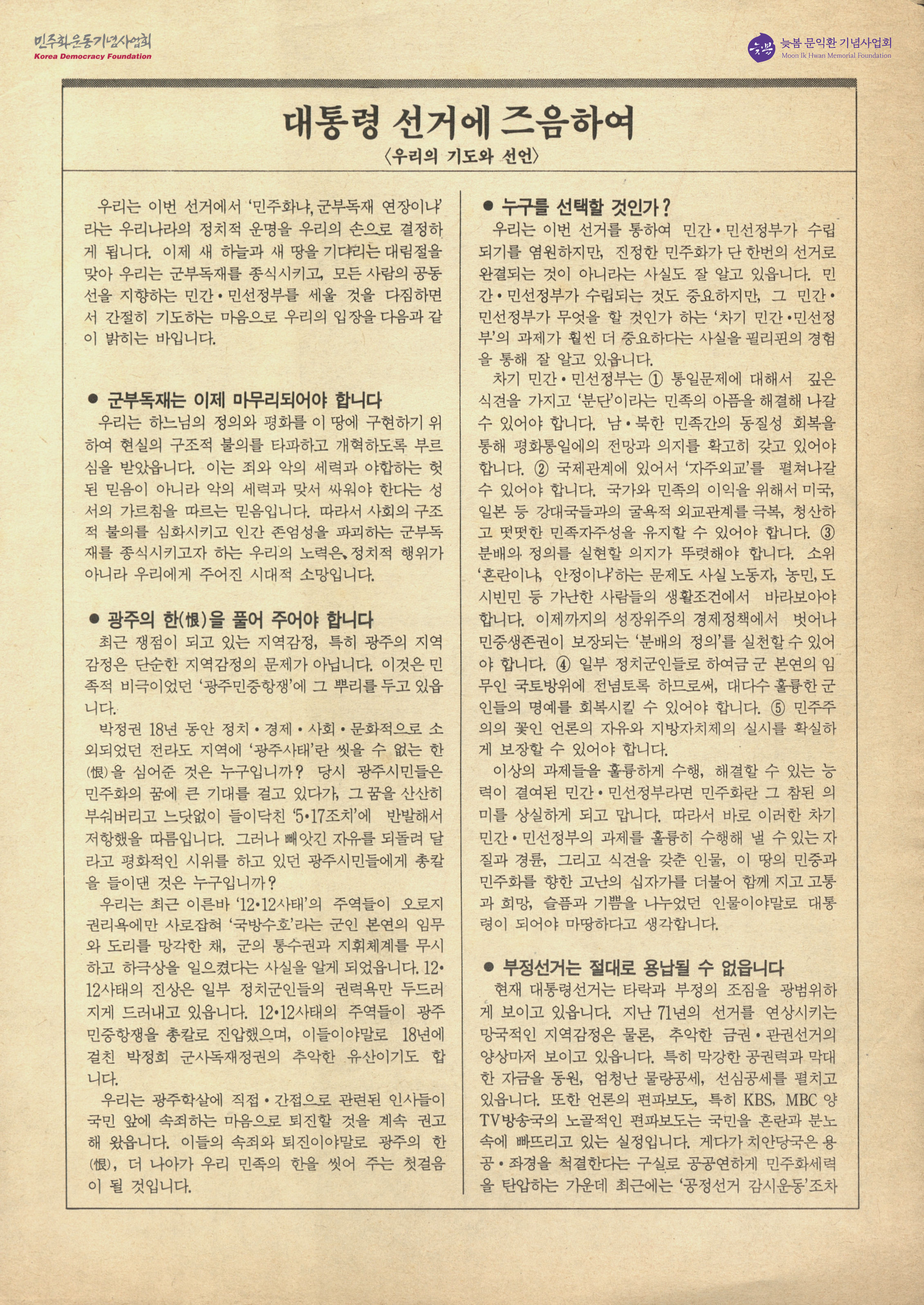 - 천주교정의구현전국사제단, 천주교서울대교구정의평화위원회에서 1987년 6월 민주항쟁 이후 들어서게 될 정부의 투표와 관련하여 군부독재 종식, 광주항쟁 재조사, 부정선거 반대 등을 내용으로 구성한 기도문과 선언문을 적어놓은 문서