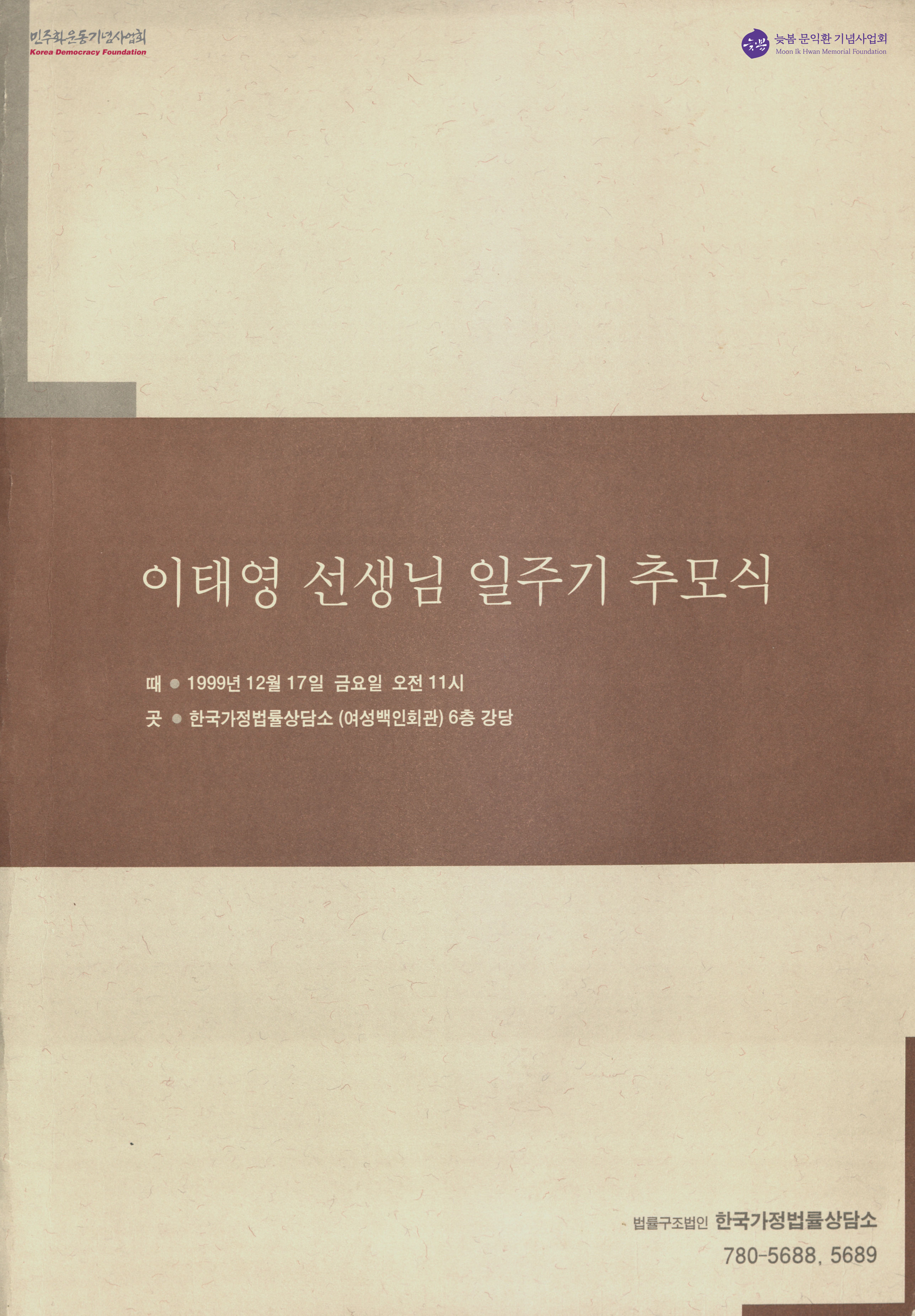 - 한국가정법률상담소에서 이태영의 일주기 추모식 행사가 열린다는 소식과 그 일시, 장소, 이태영의 약력과 자작 작품들을 적어놓은 문서