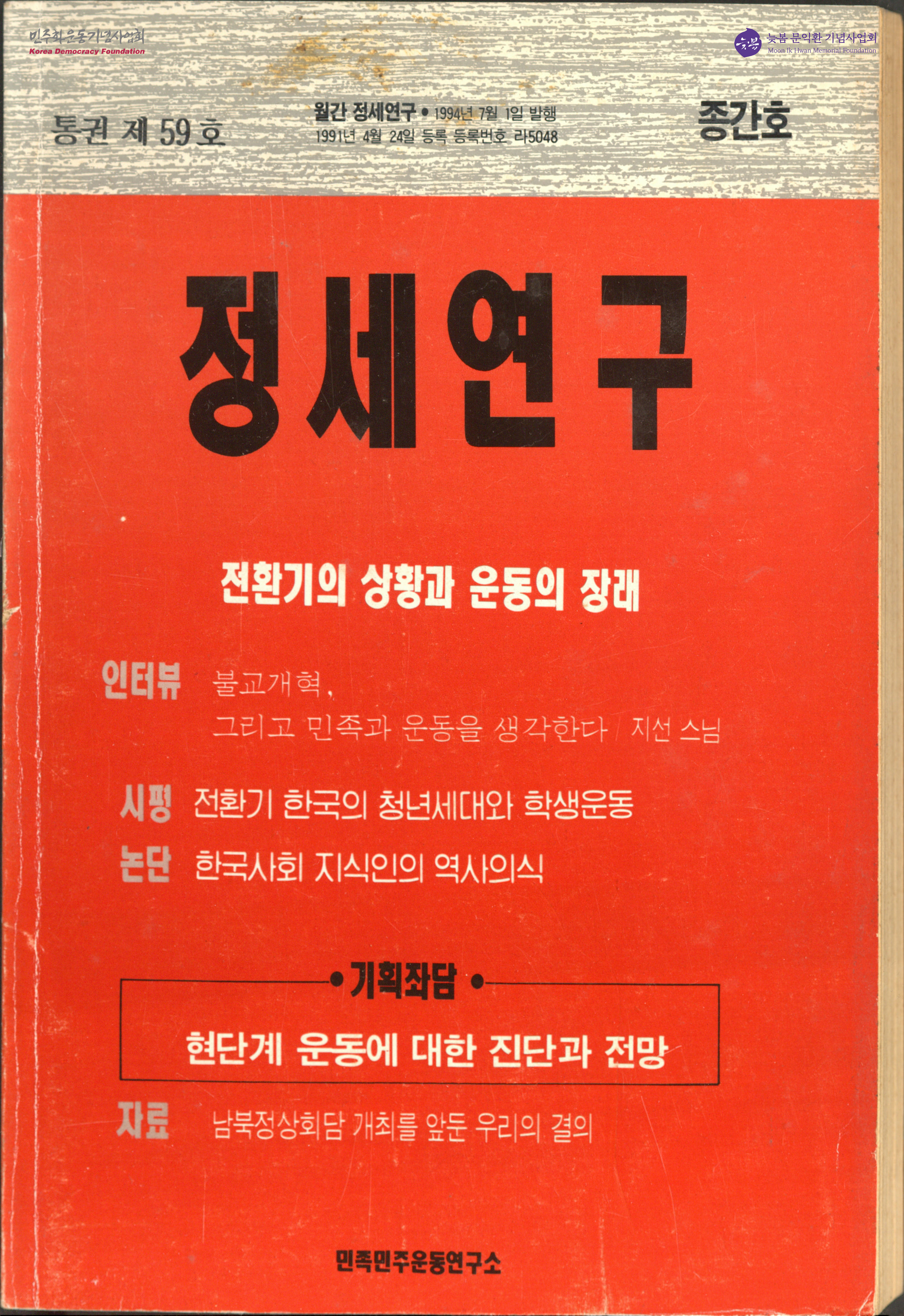 - 민족민주운동연구소에서 당시 사회 다양한 분야에 대한 정세 분석과 시사에 관한 전망글을 모아 정세연구라는 이름으로 발행한 잡지. 불교개혁 및 불교계의 민족과 운동에 대한 시각에 대한 지선과의 인터뷰와 현단계 운동에 대한 진단과 전망 좌담이 적혀 있음