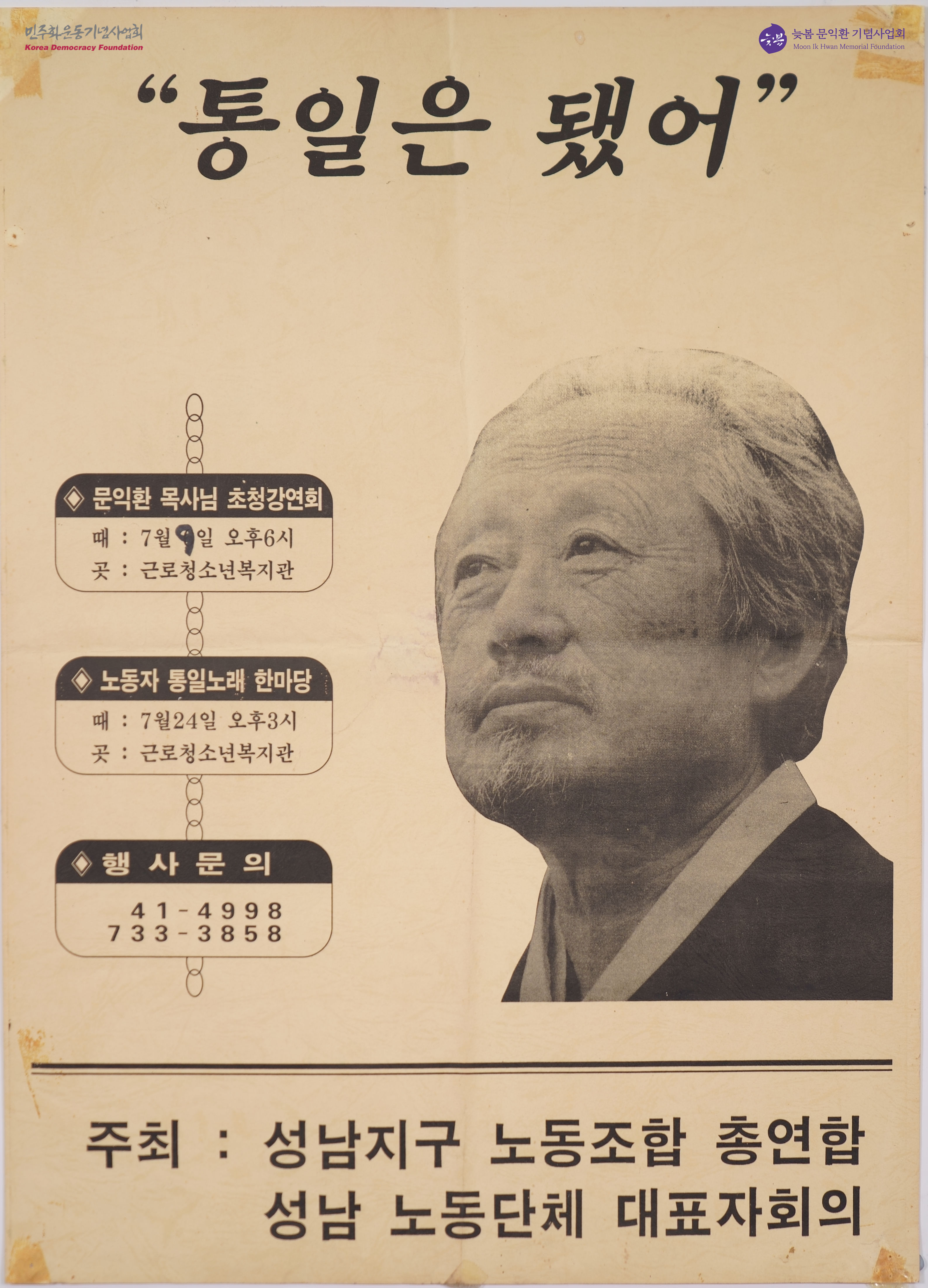 - 통일은 됐어라는 구호와 문익환 목사의 측면 사진이 담긴 포스터. 문익환 목사 초청강연회와 노동자 통일노래 한마당 행사 일시와 장소, 주최에 대해 적혀 있음
