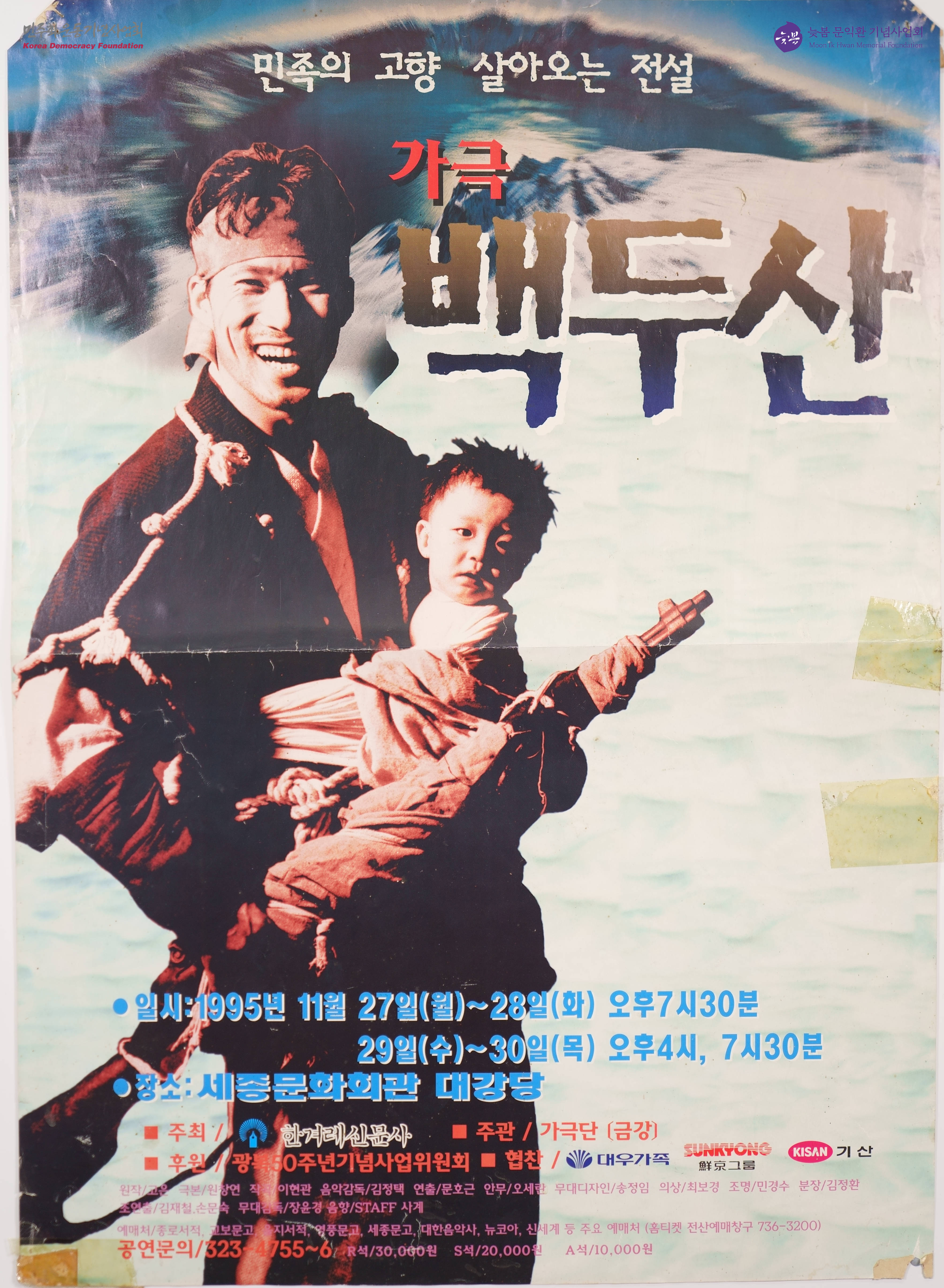 - 백두산 천지 전경을 배경으로 총과 아이를 남성이 있는 포스터. 백두산이라는 민중예술가극의 일시와 장소, 후원과 출연진들에 대한 정보가 적여 있음. 문호근 연출