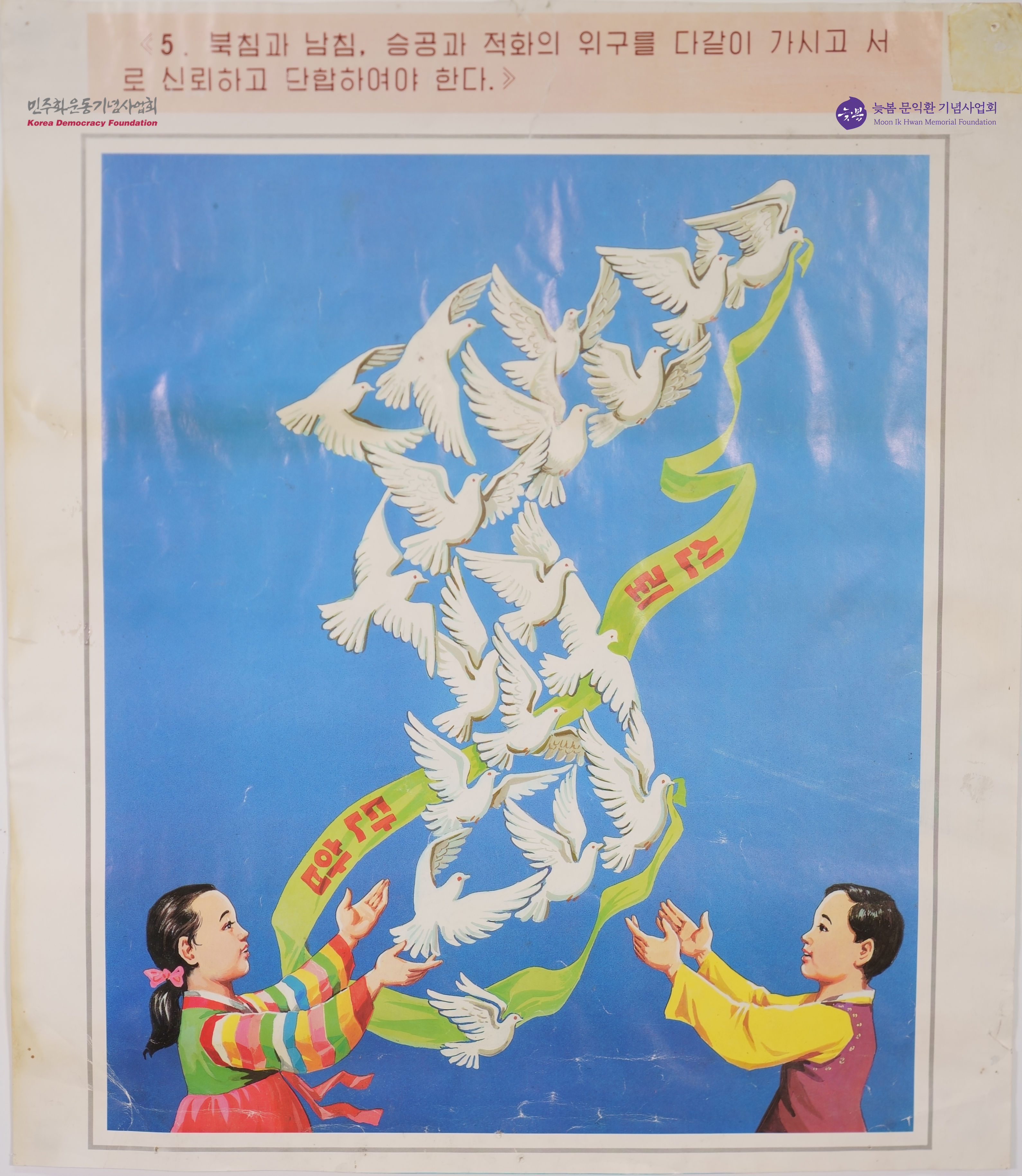 - 북한에서 발행한 한반도 모양으로 비둘기들이 모여서 신뢰와 단합이라는 문구가 적힌 리본을 가지고 있는 포스터 시리즈 중 다섯번째. 평화를 염원하는 문구가 적혀있음