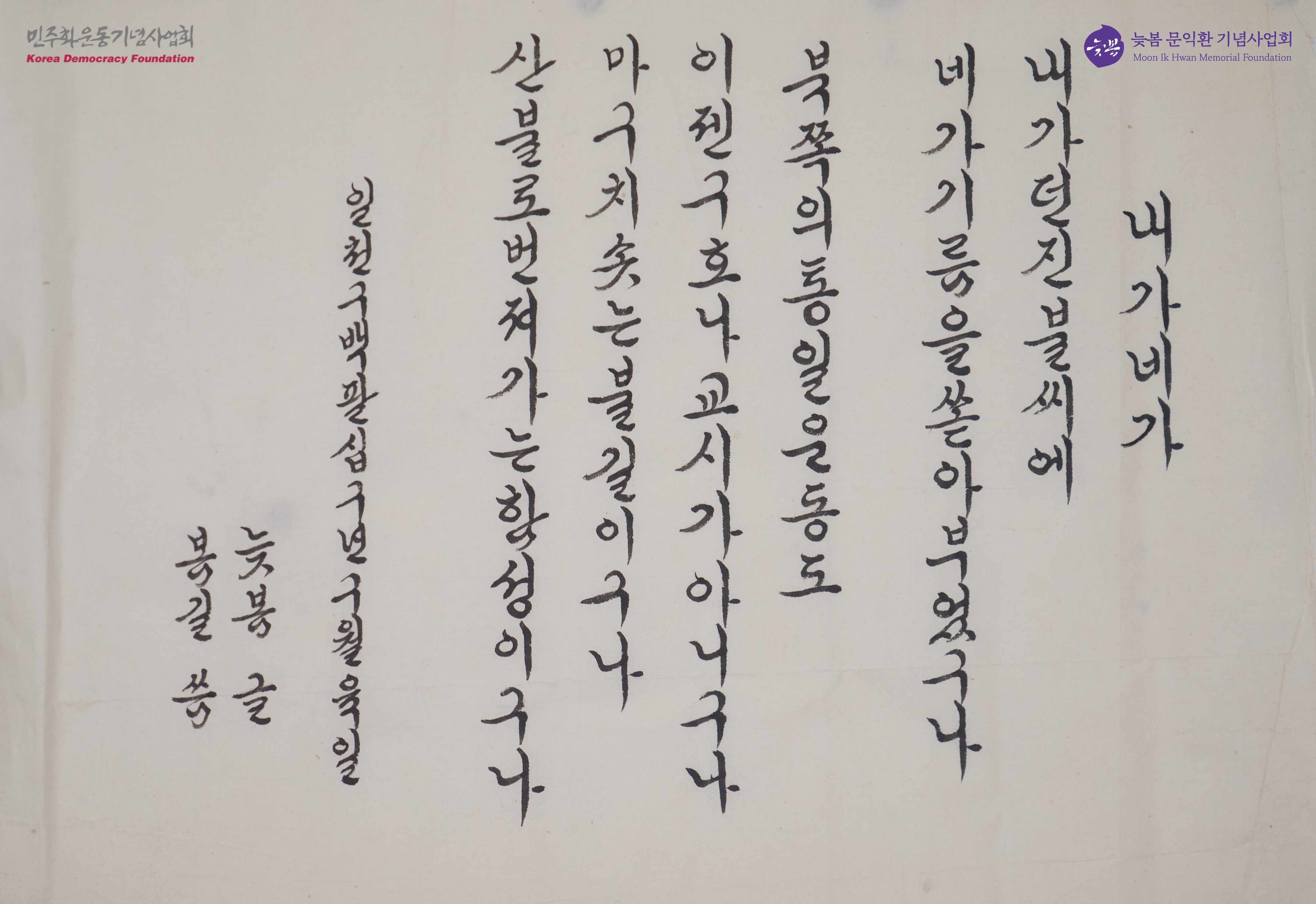 - 문익환 목사의 시 내가 네가를 보고 박용길 장로가 쓴 붓글씨. 통일이 기존까지의 미약한 운동이 아닌 산불과 같은 격렬한 움직임이 되었다는 내용이 적혀 있음