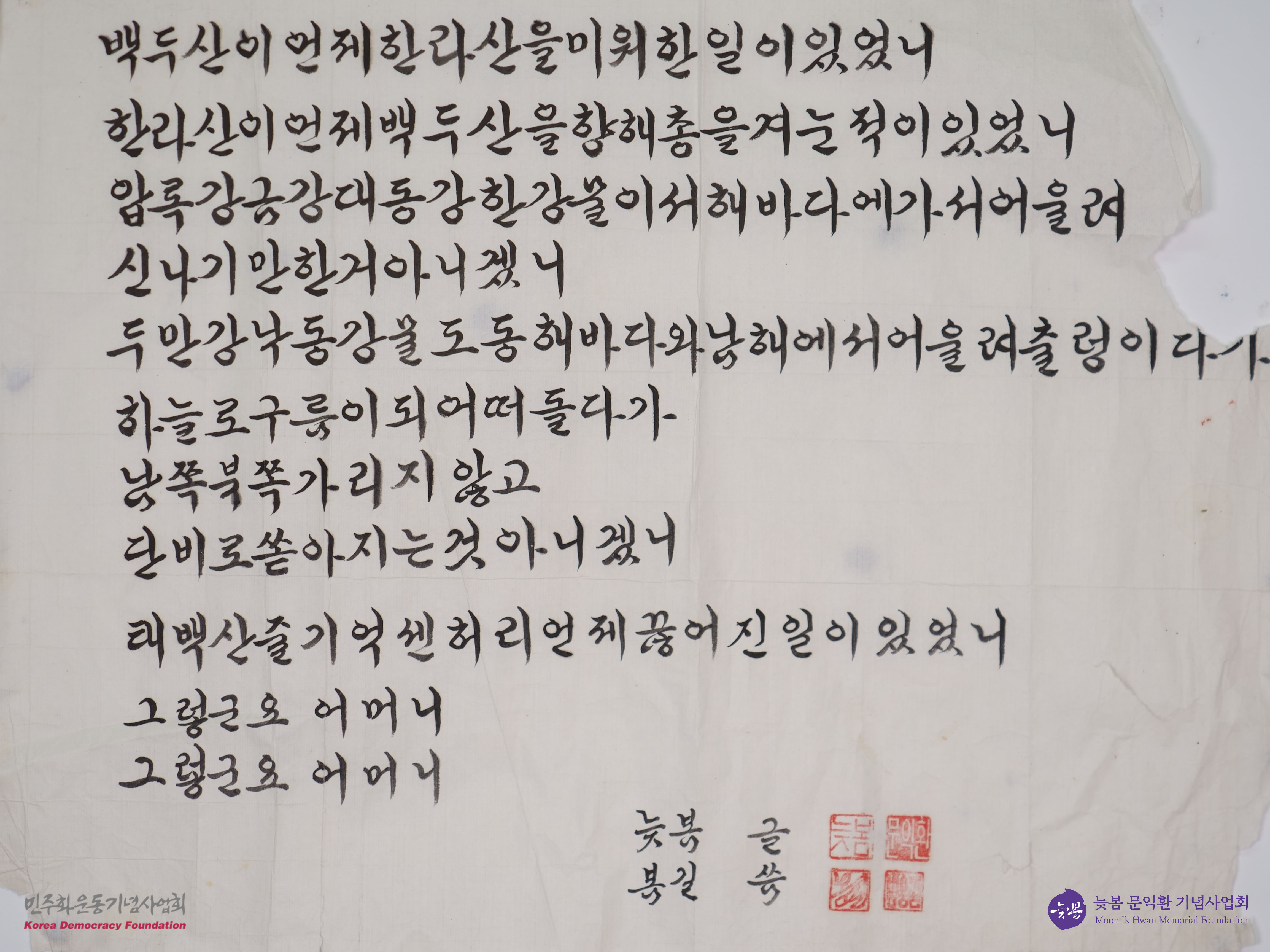 - 문익환 목사의 시 통일은 다 됐어를 보고 박용길 장로가 쓴 붓글씨. 남과 북에 있는 자연이 하나이듯이 우리들도 하나가 되어야 한다는 의지가 적혀 있음