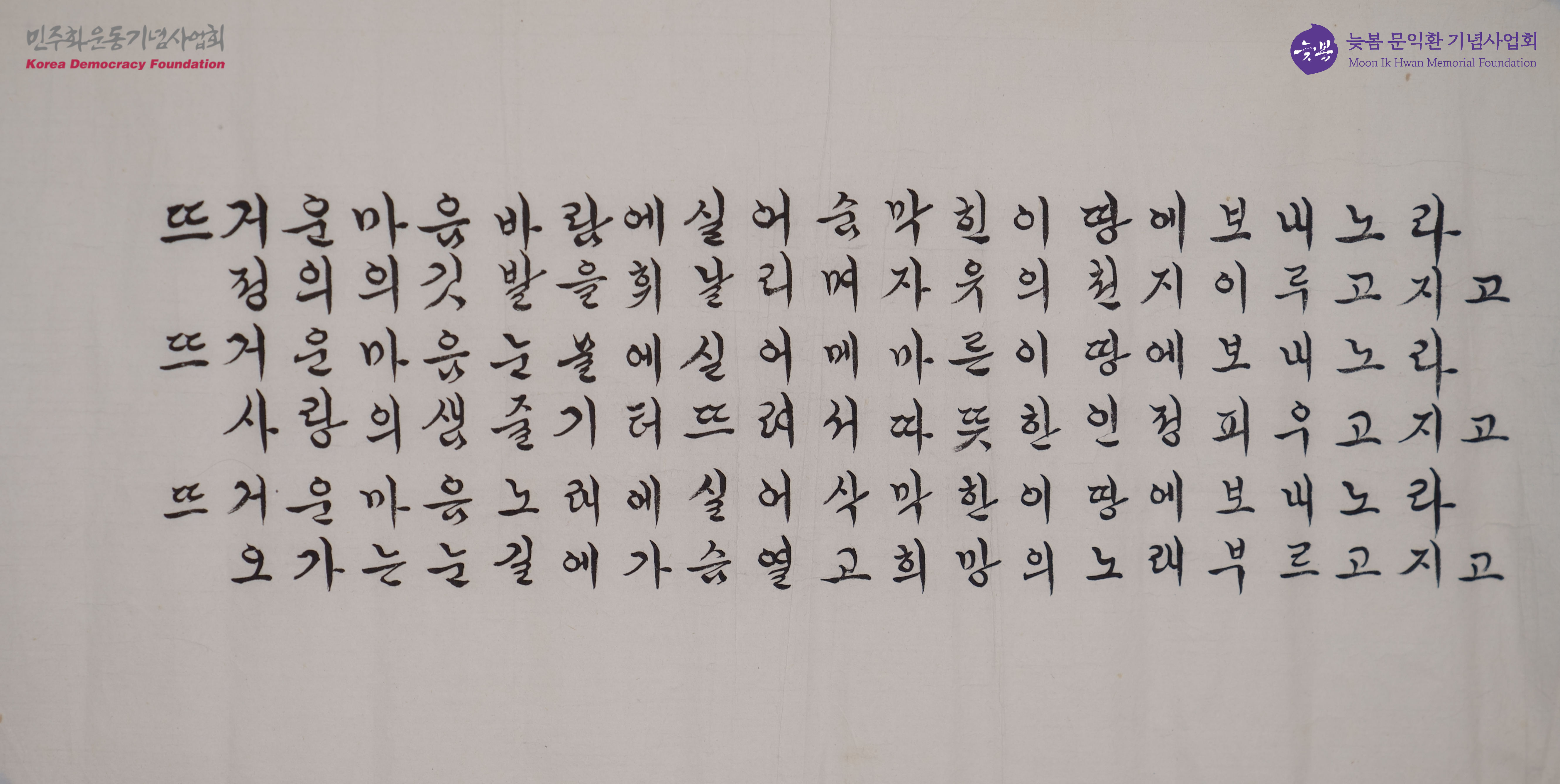 - 문익환 목사의 시 뜨거운 마음을 박용길 장로가 쓴 붓글씨. 뜨거운 마음과 자유,인정,희망을 주제로 한 내용이 적혀 있음