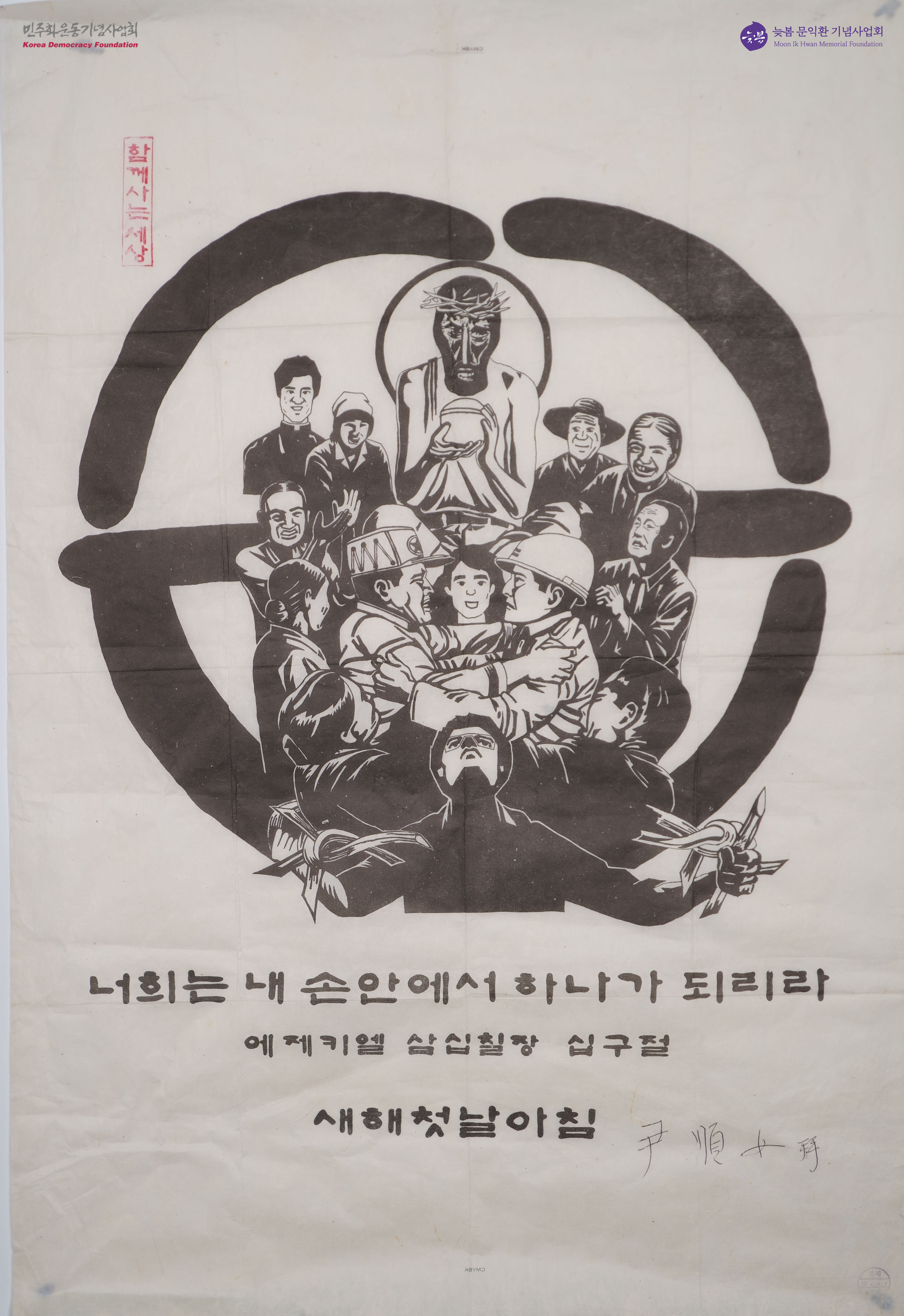 - 면류관을 쓴 예수와 남북한의 민중과 군인들이 껴안고 하나가 된 그림이 담긴 새해 카드. 에제키엘 삼십칠장 십구절 내용이 적혀 있음. 카톨릭 신도인 윤순녀 님의 새해 인사 카드로