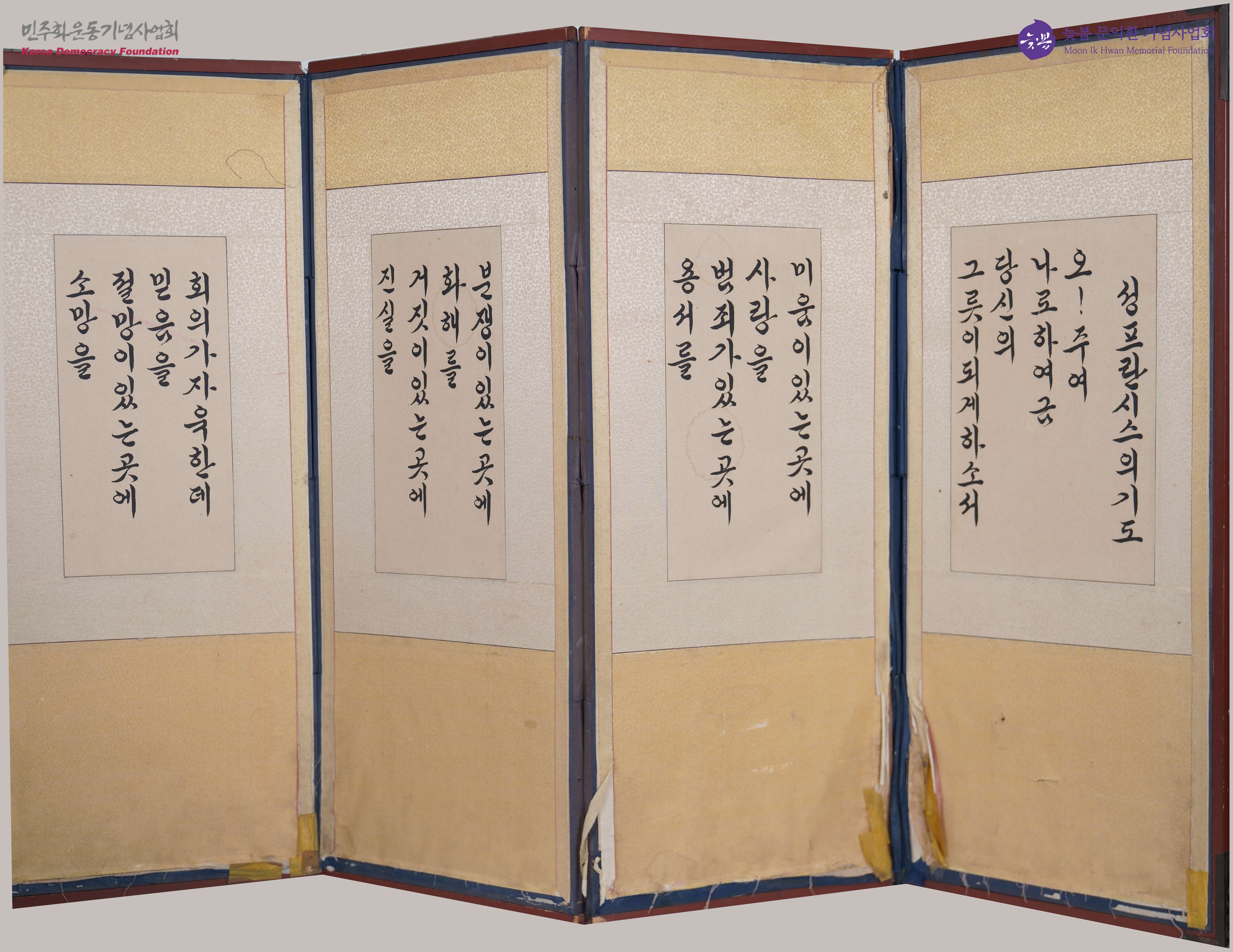 - 문호근에게 보내는 박용길 장로의 글씨가 적힌 병풍. 성 프란체스코의 기도가 적혀 있음
