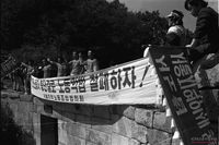 - 1987년 고려대 학생들이 교내에서 제27주년 4.18기념집회를 마친 후 교문으로 진출해 구국의 대행진을 벌이고 있다.