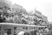 - 6.10국민대회에 이어 명동성당 철야농성 및 시위를 지속하는 시위대에게 신부가 무엇인가를 말하고 있다.