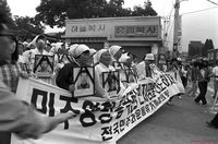 - 6월항쟁에 참여한 대학생과 시민들이 명동성당에서 태극기를 앞세우고 시위하고 있다.
