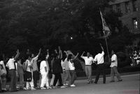 - 연세대생 7천여 명이 노천극장에서 제3차 총회를 갖고 이한열의 부상과 경찰의 무차별 과잉진압을 규탄한 뒤 교문으로 진출하자 최루탄을 투척하고 학내로 진입하고 있다.