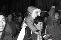 - 호헌분쇄, 제헌의회 소집을 요구하는 성균관대 학생들이 가두진출을 막는 경찰들을 향해 화염병을 던지고 있다.