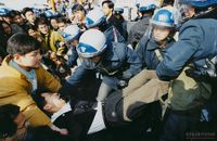 - 연세대 노천극장에서 열린 독재종식과 호헌철폐를 위한 서울지역대회에서 전두환 대통령과 성조기 화형식을 준비하고 있다.