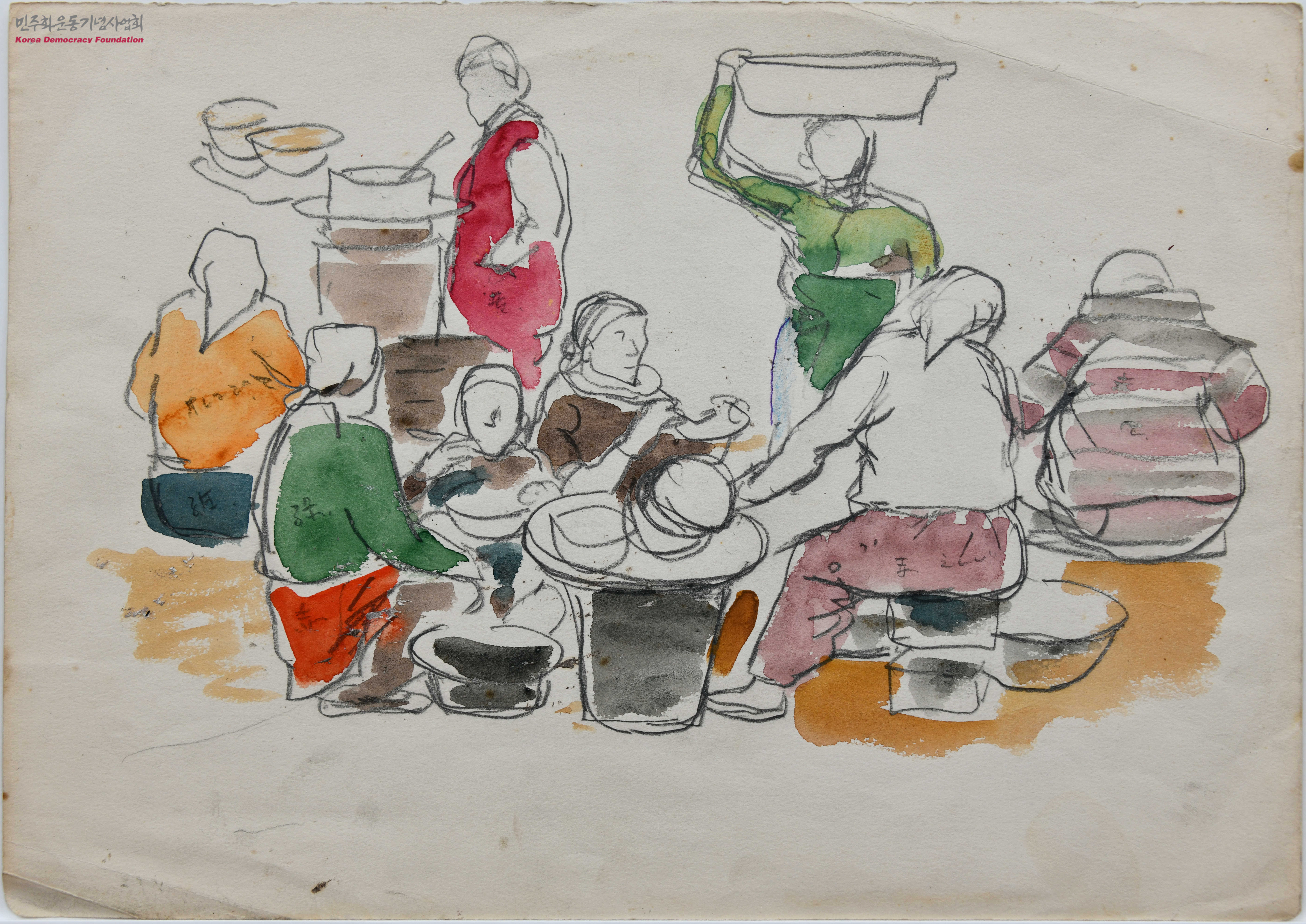 - 음식을 하는 사람과 음식을 먹는 사람, 물건을 나르는 사람 등 시장의 풍경을 남긴 것으로 추정되는 그림