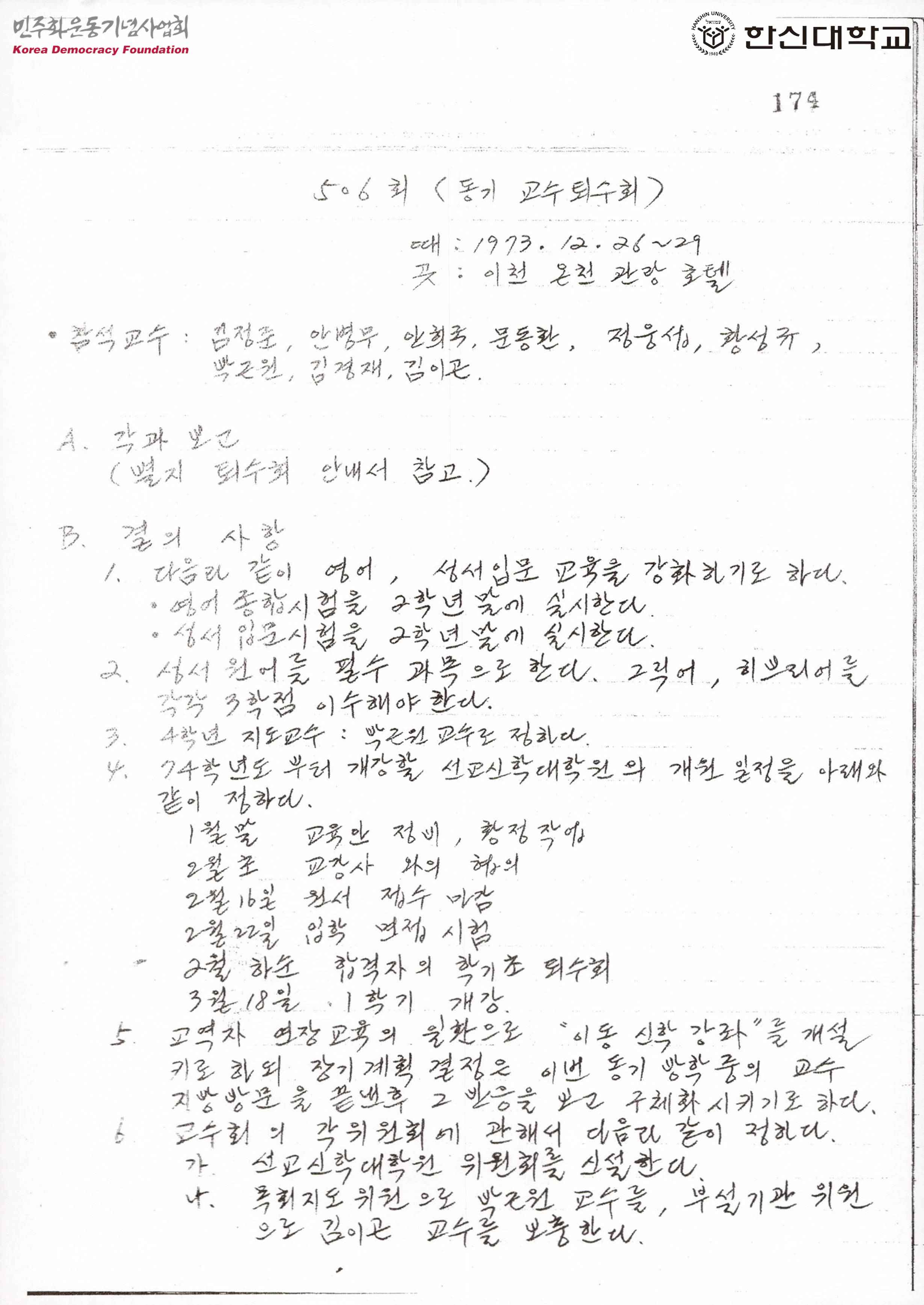 제506회 한신대 교수회의록 <동기 교수퇴수회>
