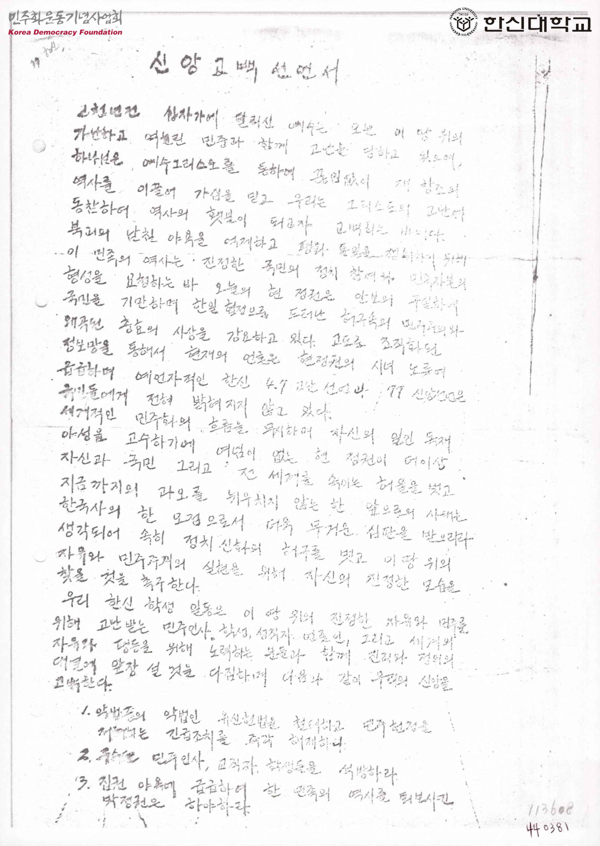 - 정권의 외교 경제 정책·언론 통제 비판과 유신 철폐, 긴급조치 즉각 해제, 구속된 민주인사·교직자·학생 석방, 박 정권의 하야란 신앙 고백의 내용 등이 있는 선언서