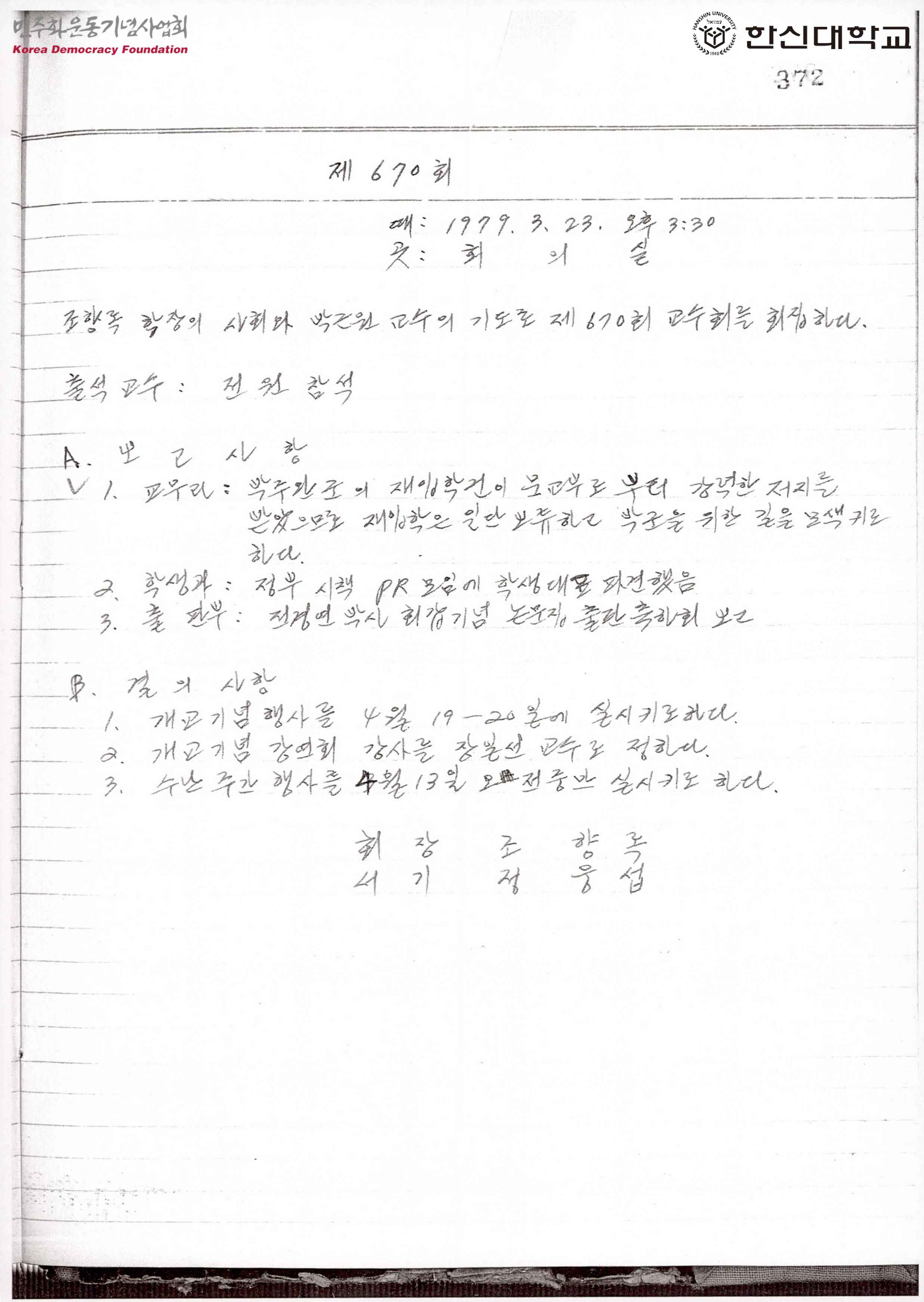 - 학생 1명 재입학에 대해 문교부로부터 강력한 저지를 받았기에 다른 길을 모색하기로 했다는 내용 등을 다룸
