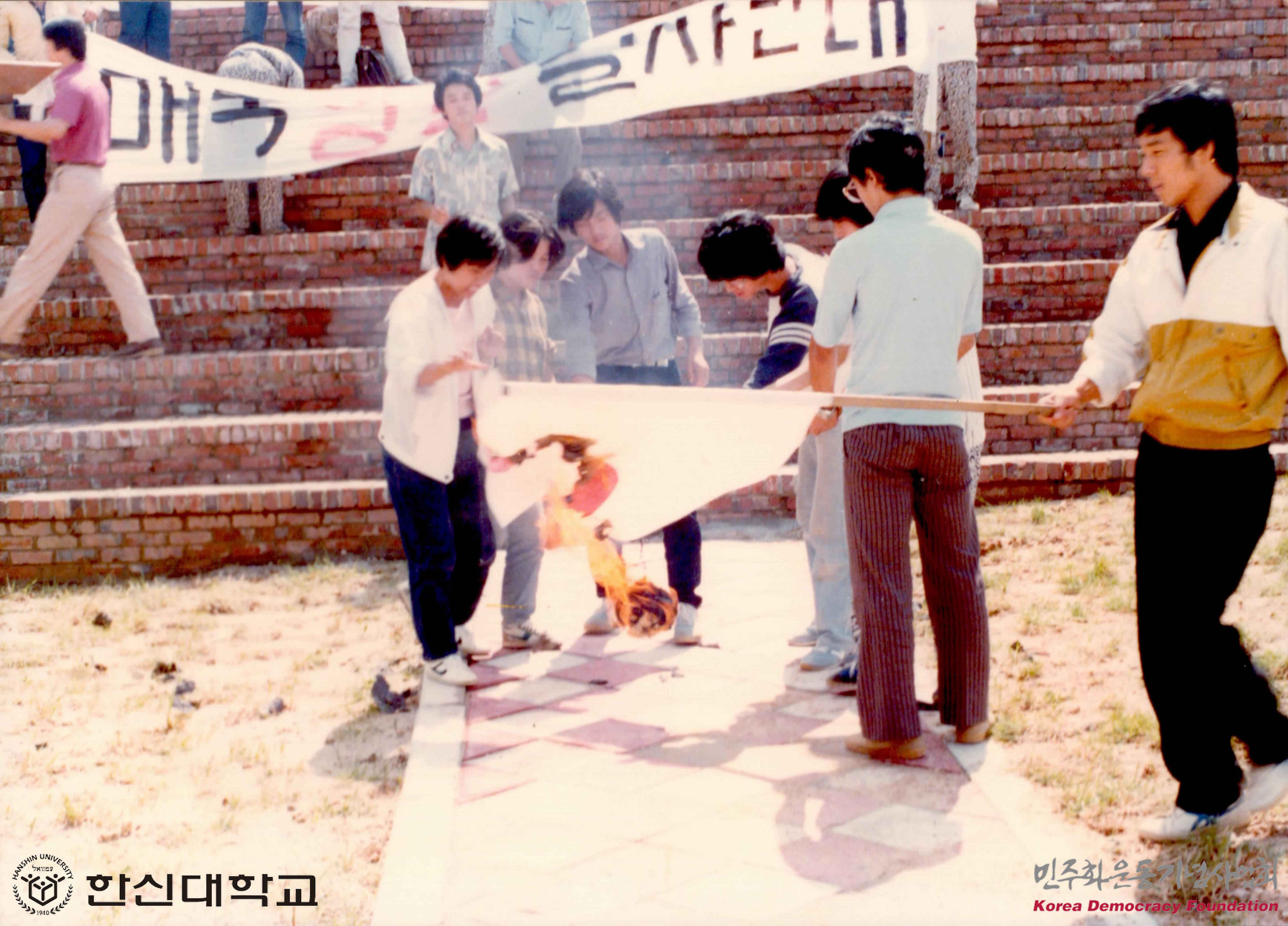 - 매국방일 결사반대' 현수막을 든 채, 일장기를 불태우고 있는 것으로 추정되는 사진