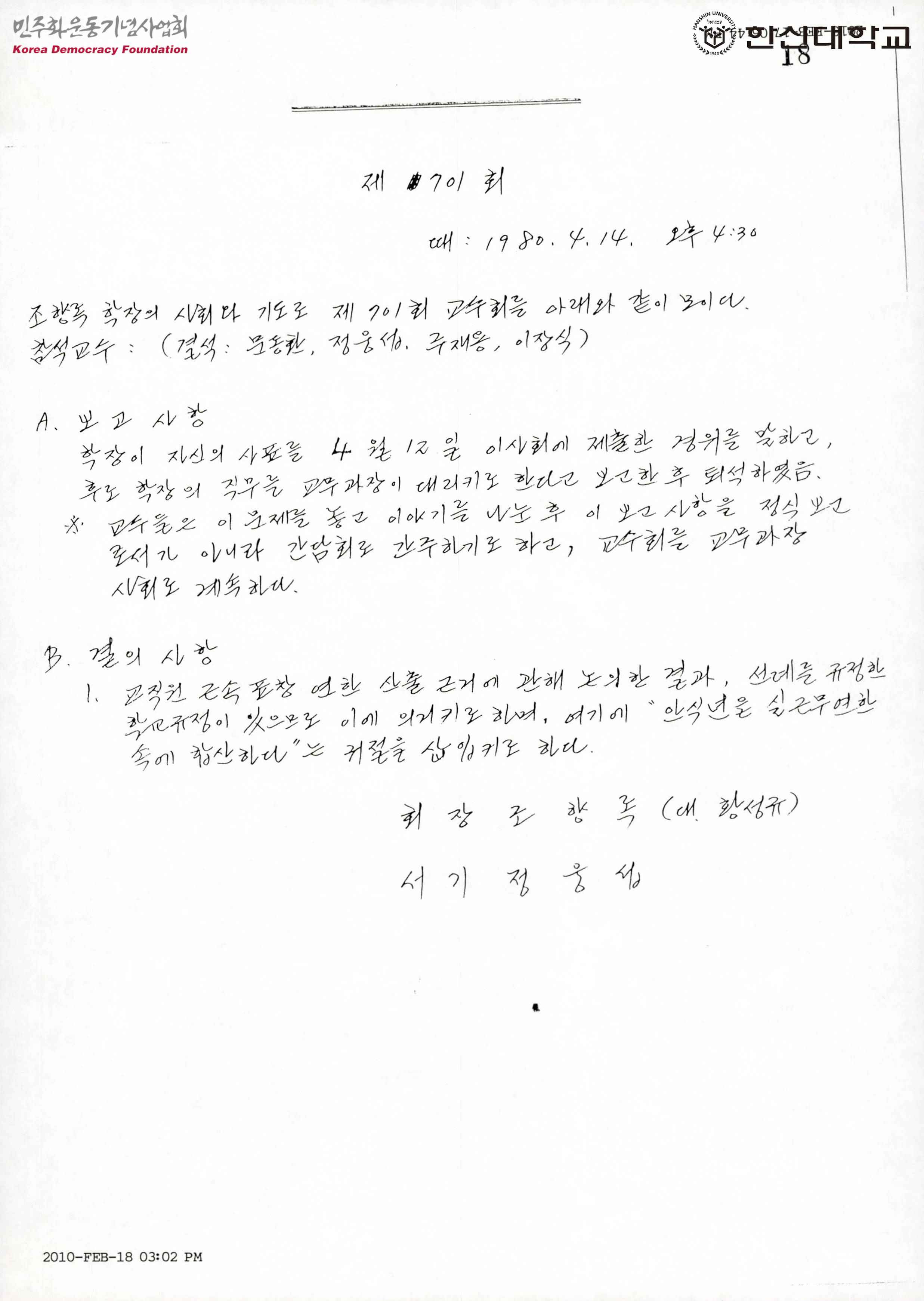 - 학장이 4월 12일 이사회에 제출한 경위를 말하고 학장 직무를 교무과장에게 대리하게 한다고 보고한 후 퇴석했다는 보고 등을 다룸