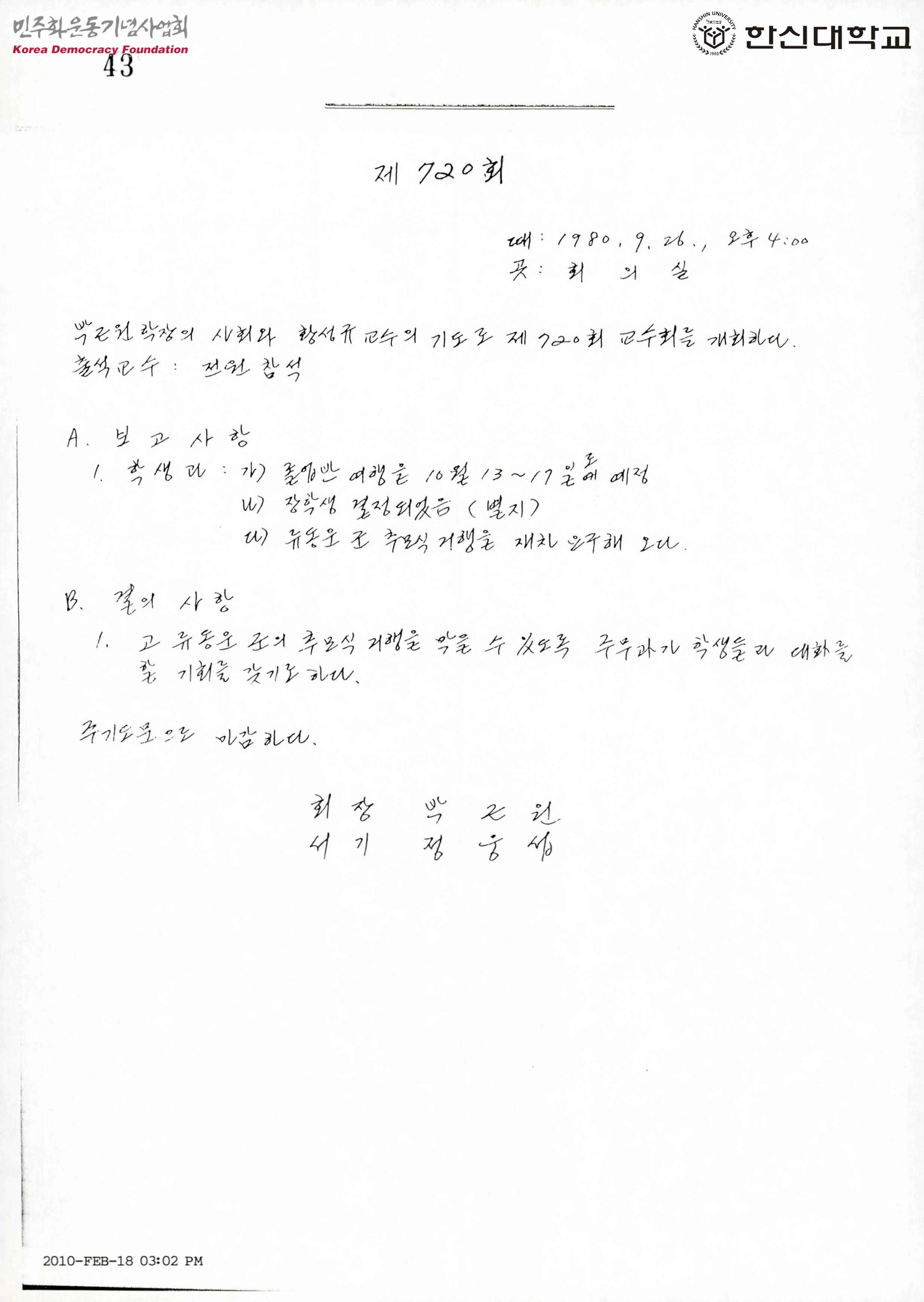 제720회 한신대 교수회의록