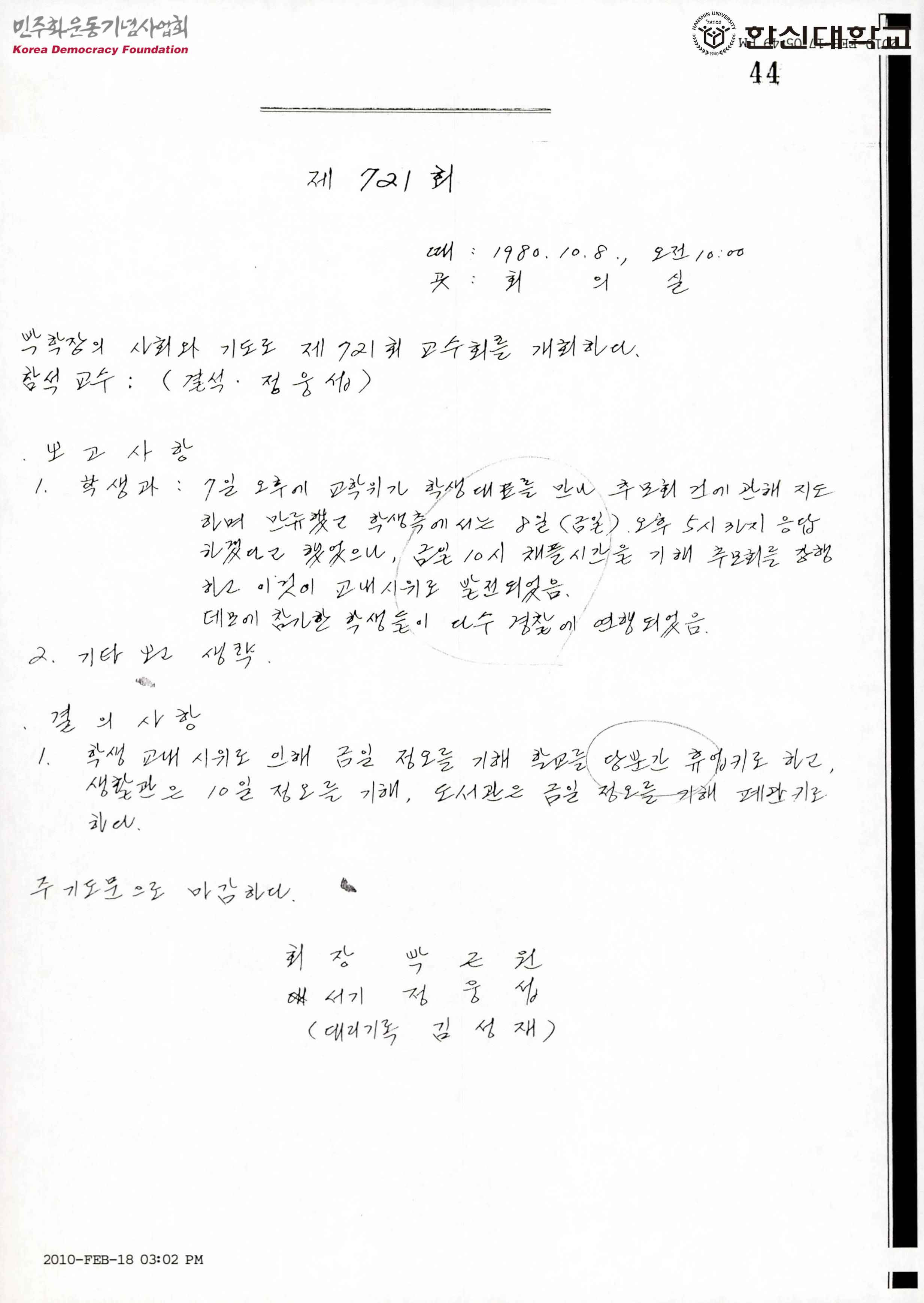 제721회 한신대 교수회의록