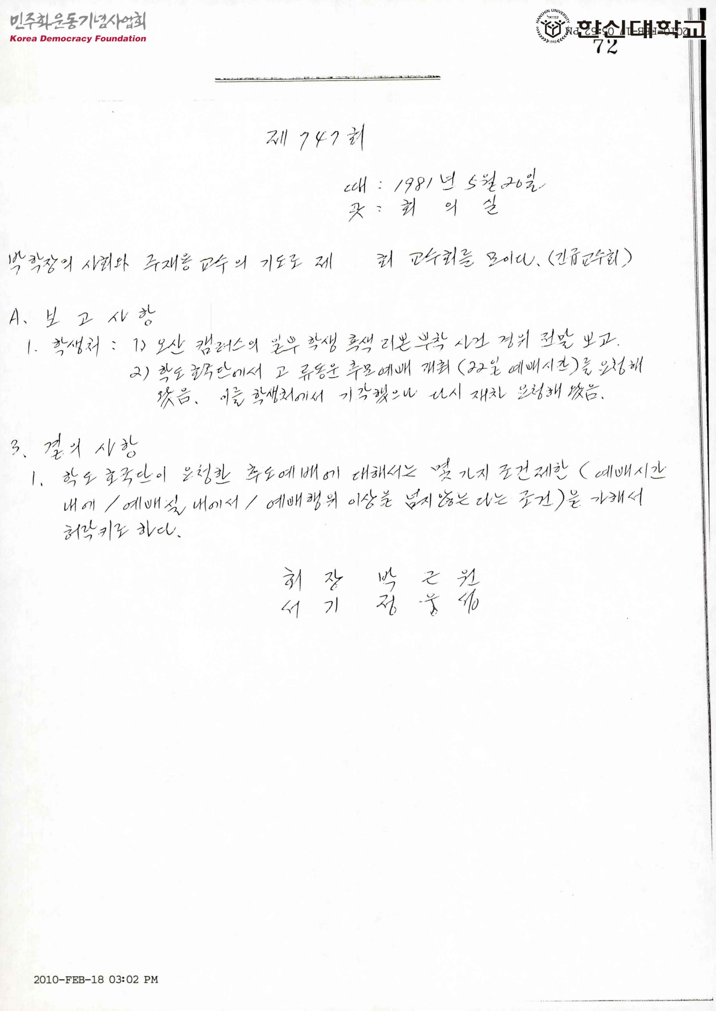 - 오산 캠퍼스 일부 학생 흑색리본 부착 사건 경위 전말 보고와 학도호국단의 고 류동운 추모예배 개최(22일)를 요청했고 기각했으나 재차 요청했다는 보고와 추모예배에 대해 조건제한(예배시간 내에, 예배실 내에서, 예배행위 이상을 넘지 않는다는 조건)을 가해서 허락하기로 결의한 내용을 다룸