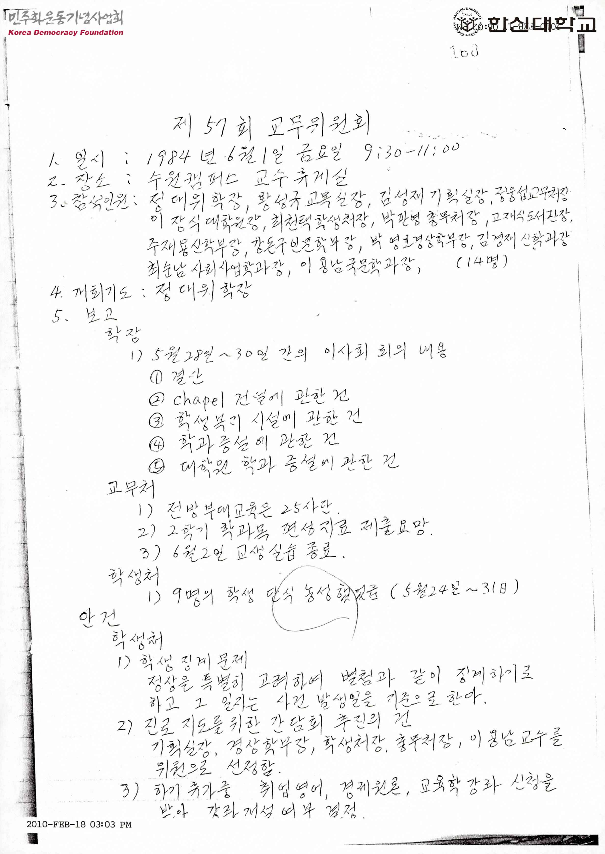 - 학장 및 교무처의 보고내용과 9명의 학생이 단식농성을 진행했었다는 내용 및 학생 징계문제에 대한 내용이 포함