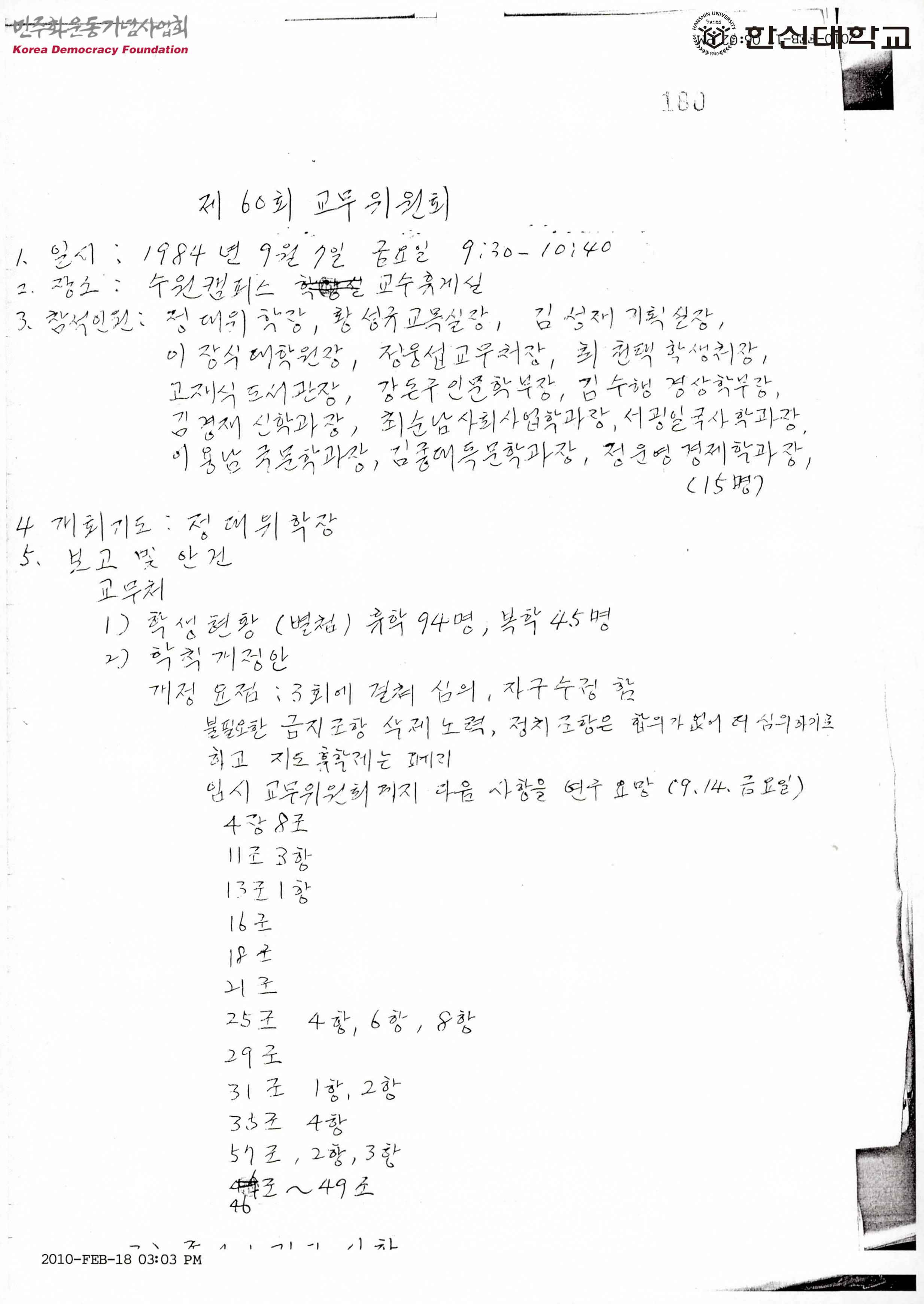 - 학생 현황, 학칙개정(안) 관련, 방일 및 대일관계 기도회 및 시위에 관한 내용이 포함된 회의록