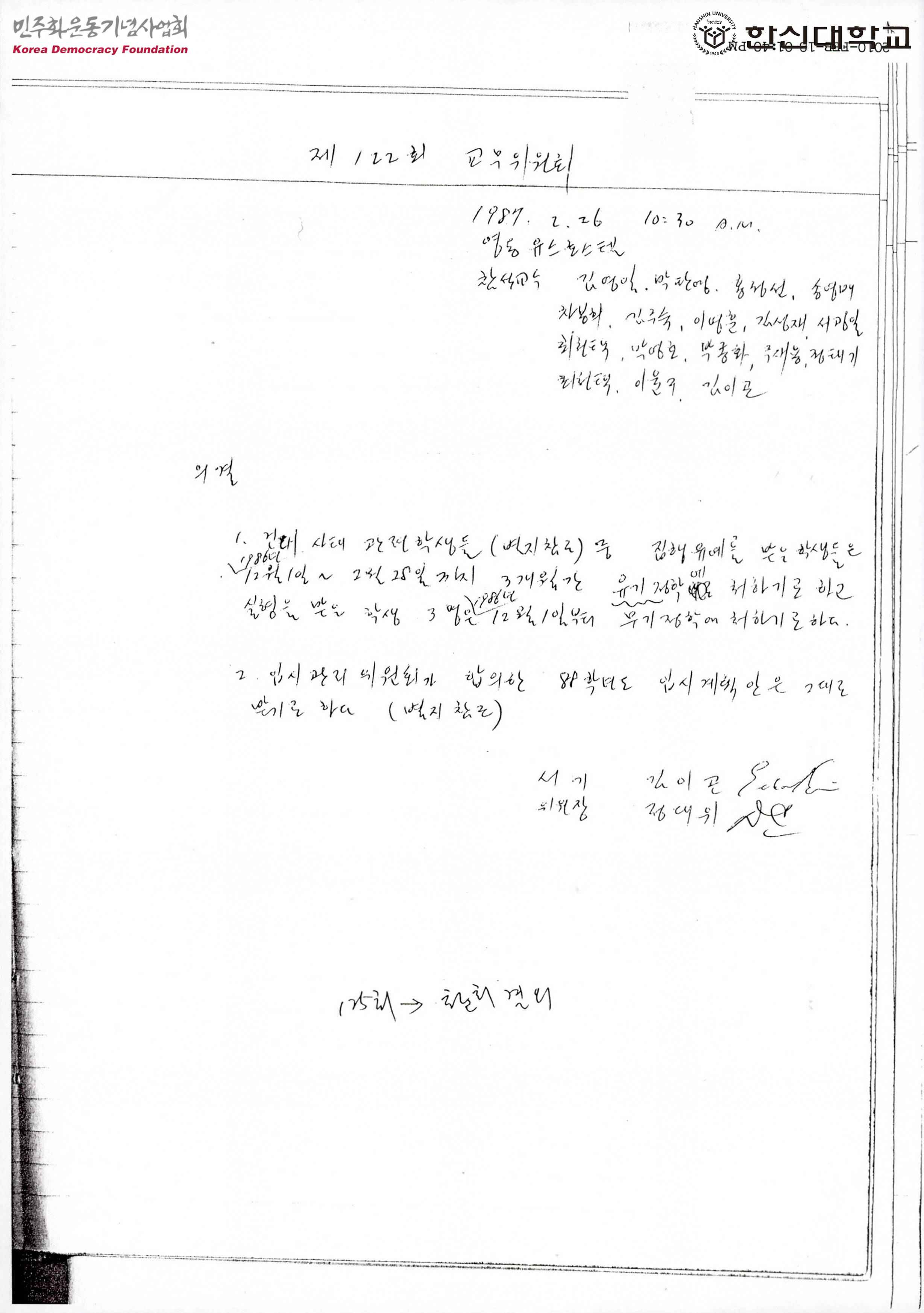 - 건대사태 관련학생들 중 집행유예를 받은 학생들에게는 유기정학을, 실형을 받은 학생 3명에게는 무기정학에 처하기로 한다는 내용이 적힌 회의록