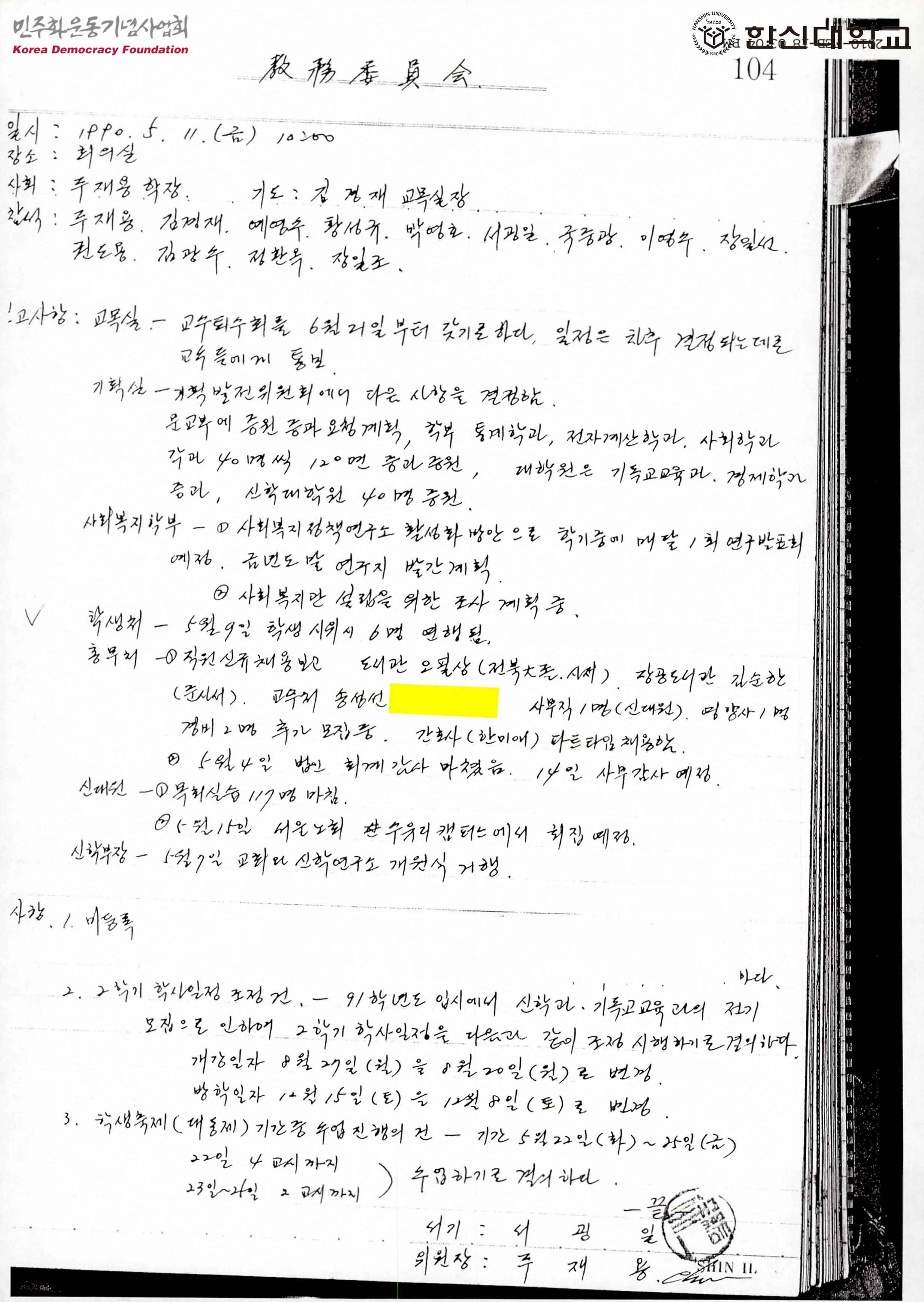 90년 5월 11일 한신대 교무위원회