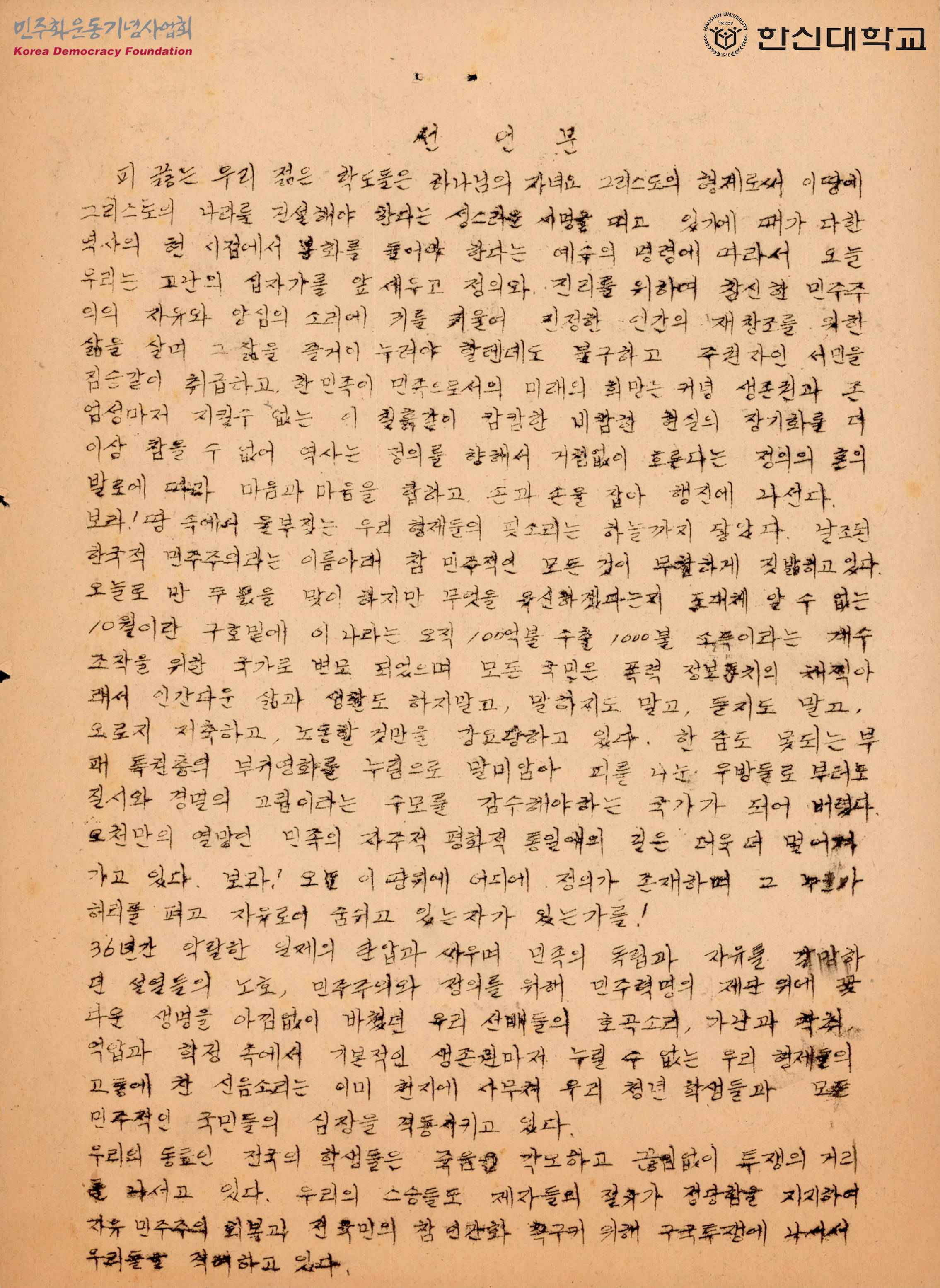 - 유신 철폐, 군법회의 해산 및 판결 무효화, 정보부 해체, 언론·집회·결사·시위의 자유 및 신앙과 양심의 자유 보장, 국민의 생존권 보장 및 반민중적 경제시책 포기, 안보 또는 통일 명분의 전제통치방법 지양 및 헌정질서 회복, 구속자 석방 및 수사요원 철수, 미국 등 우방의 한국 정권의 부패 등을 조장, 지원, 묵과하지 말라는 주장과 그를 위해 민주적 이념과 뜻을 전파하고 심문에 대해 묵비권을 행사할 것이라는 등의 행동강령을 내용으로 하는 선언문