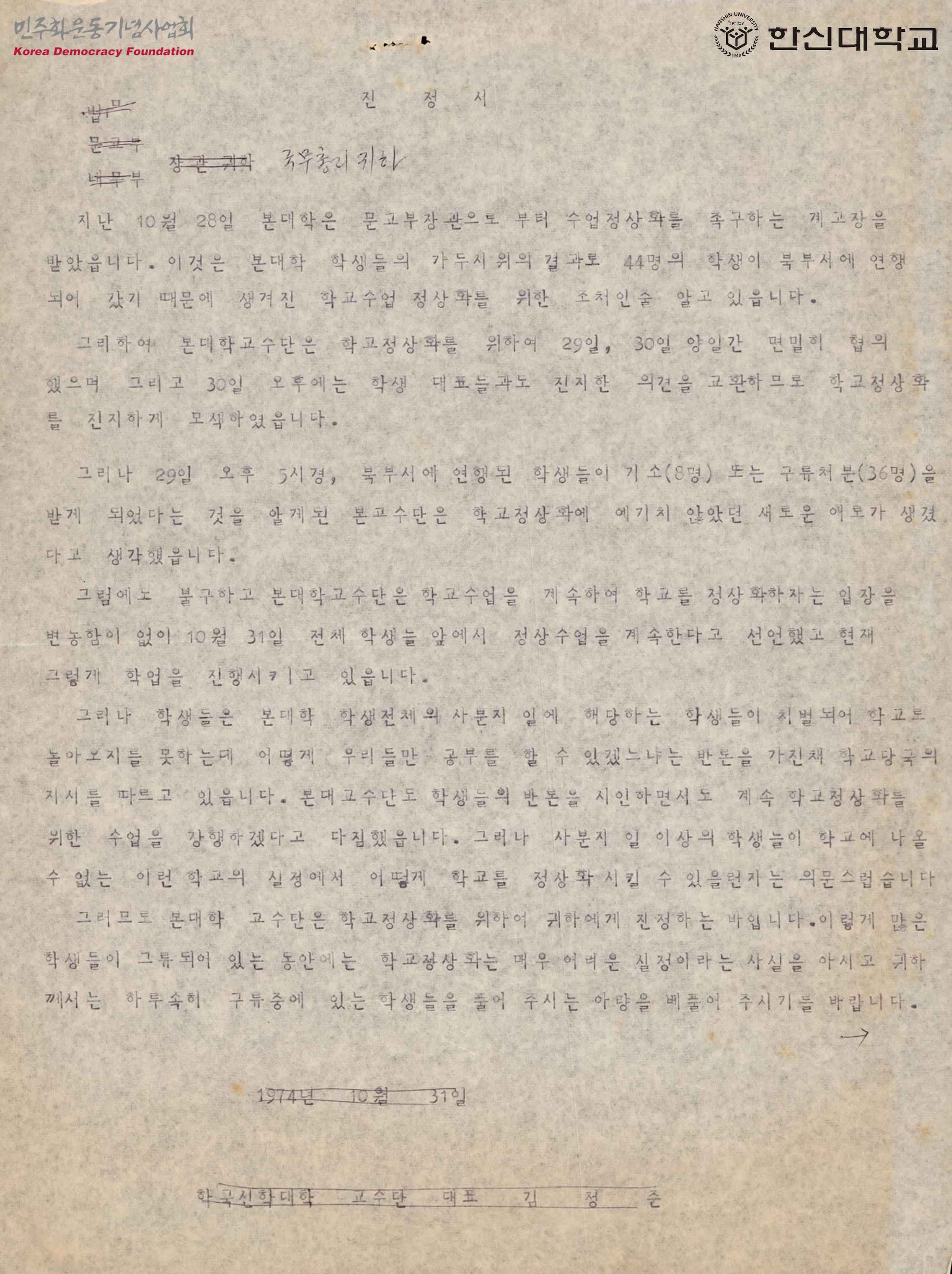 - 국무총리를 수신자로 하는, 10월 29일이 학생 8명은 기소, 36명은 구류 처분을 받게 됨에 따라 사분지 일 이상의 학생이 학교에 나올 수 없는 상황에서 학교정상화를 할 수 없다며 학생들을 풀어주기를 원한다는 내용과 학교정상화 문제 관련 면담을 요청하는 내용의 진정서