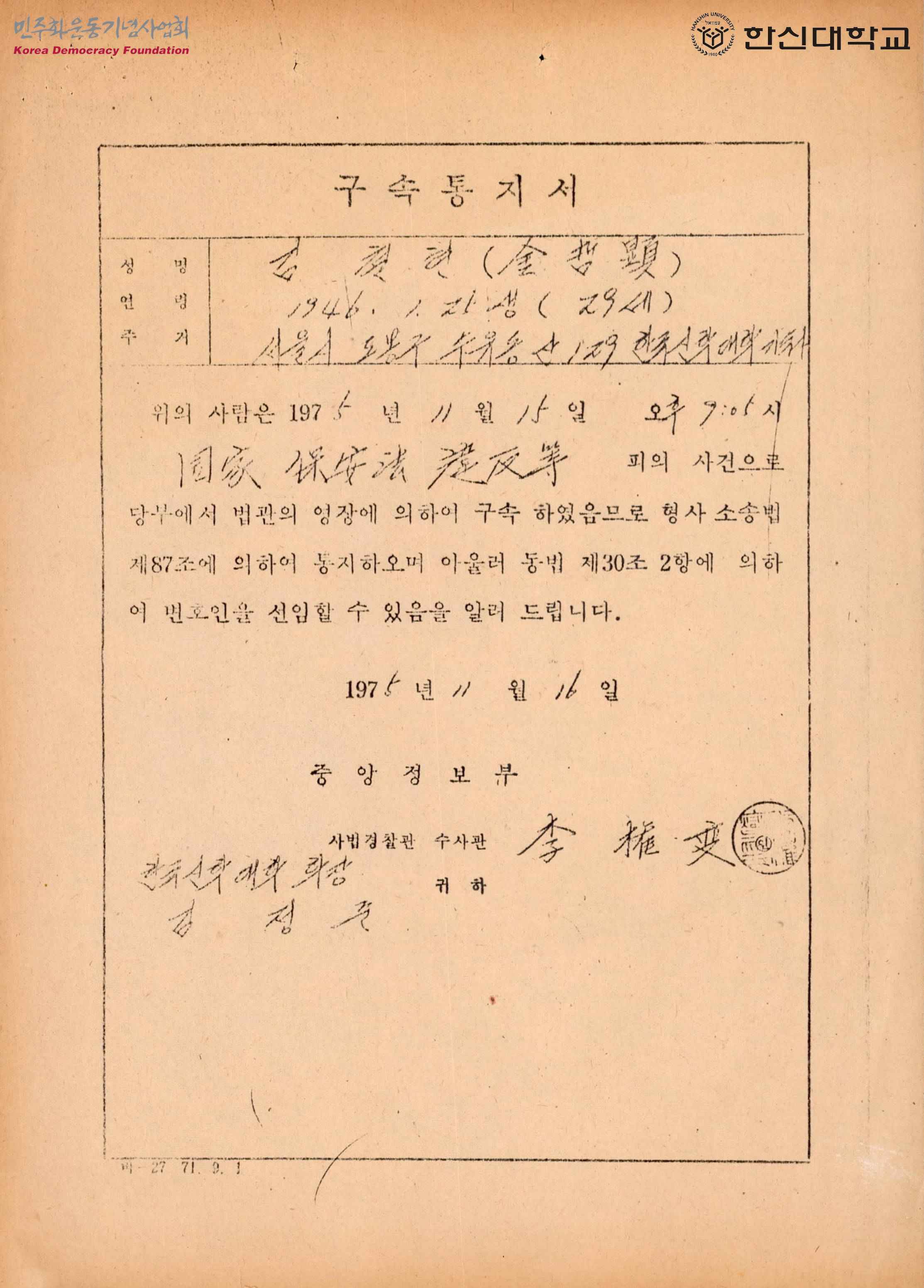 구속통지서[학원 간첩단 사건 관련자 김철현]